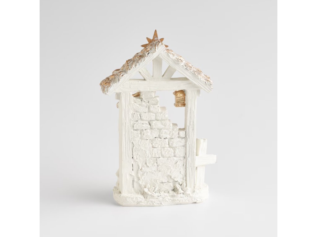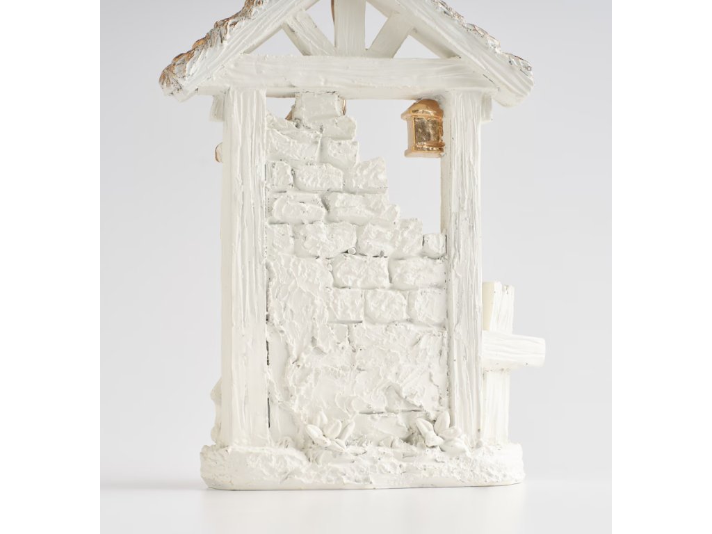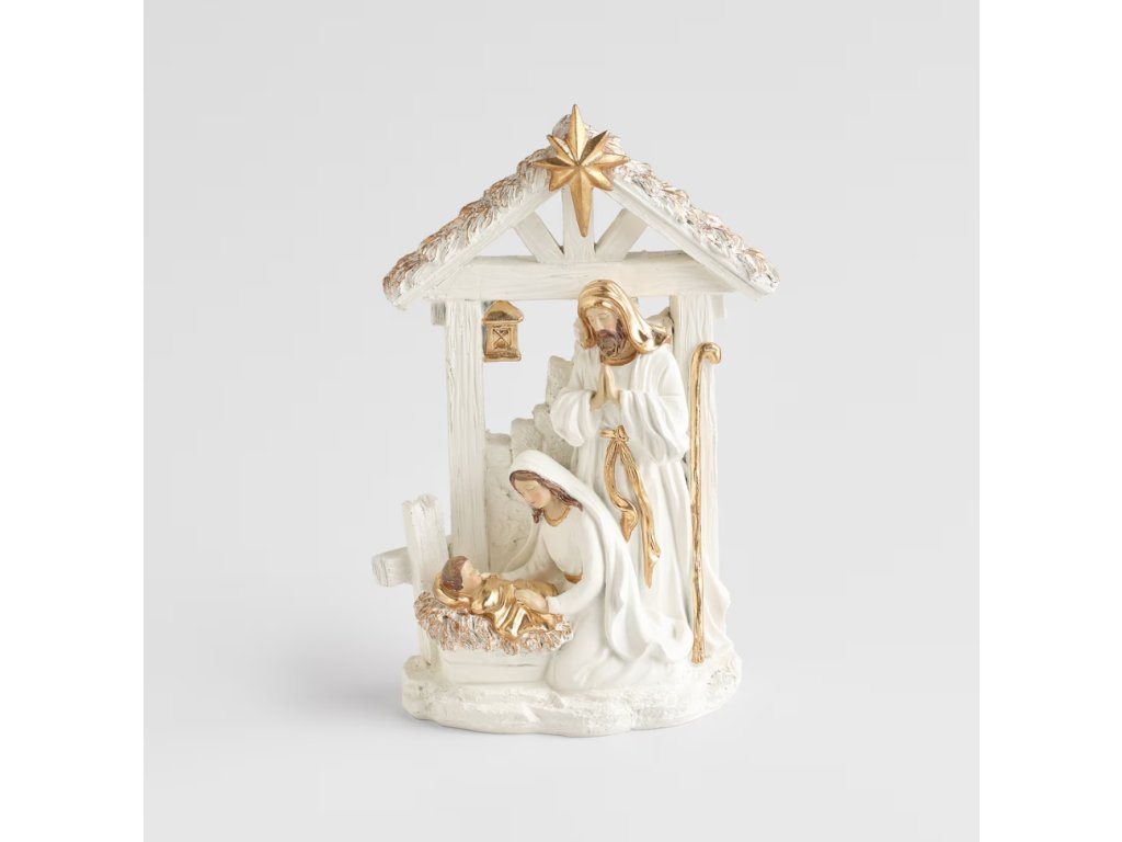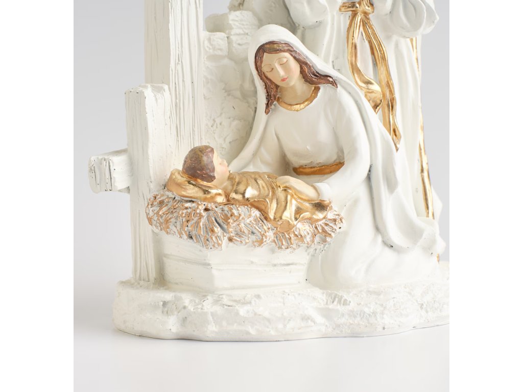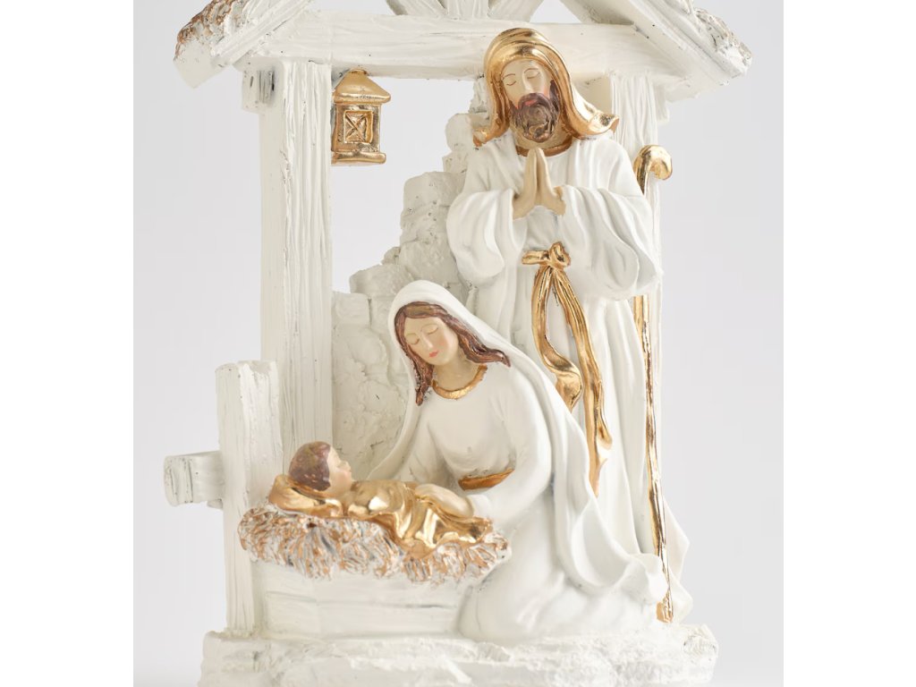 Zlatá figúrka Svätej rodiny v betleheme je elegantným symbolom Vianoc. Dekorácia je vyhotovená z bielej živicovej hmoty s precíznymi zlatými akcentmi na postavách a strieške, čo jej dodáva luxusný a slávnostný vzhľad. Figúrka s výškou 25 cm zobrazuje Máriu, Jozefa a malého Ježiška pod jednoduchou strieškou a je ideálna na vytvorenie elegantnej a tradičnej vianočnej dekorácie vo vašom domove.