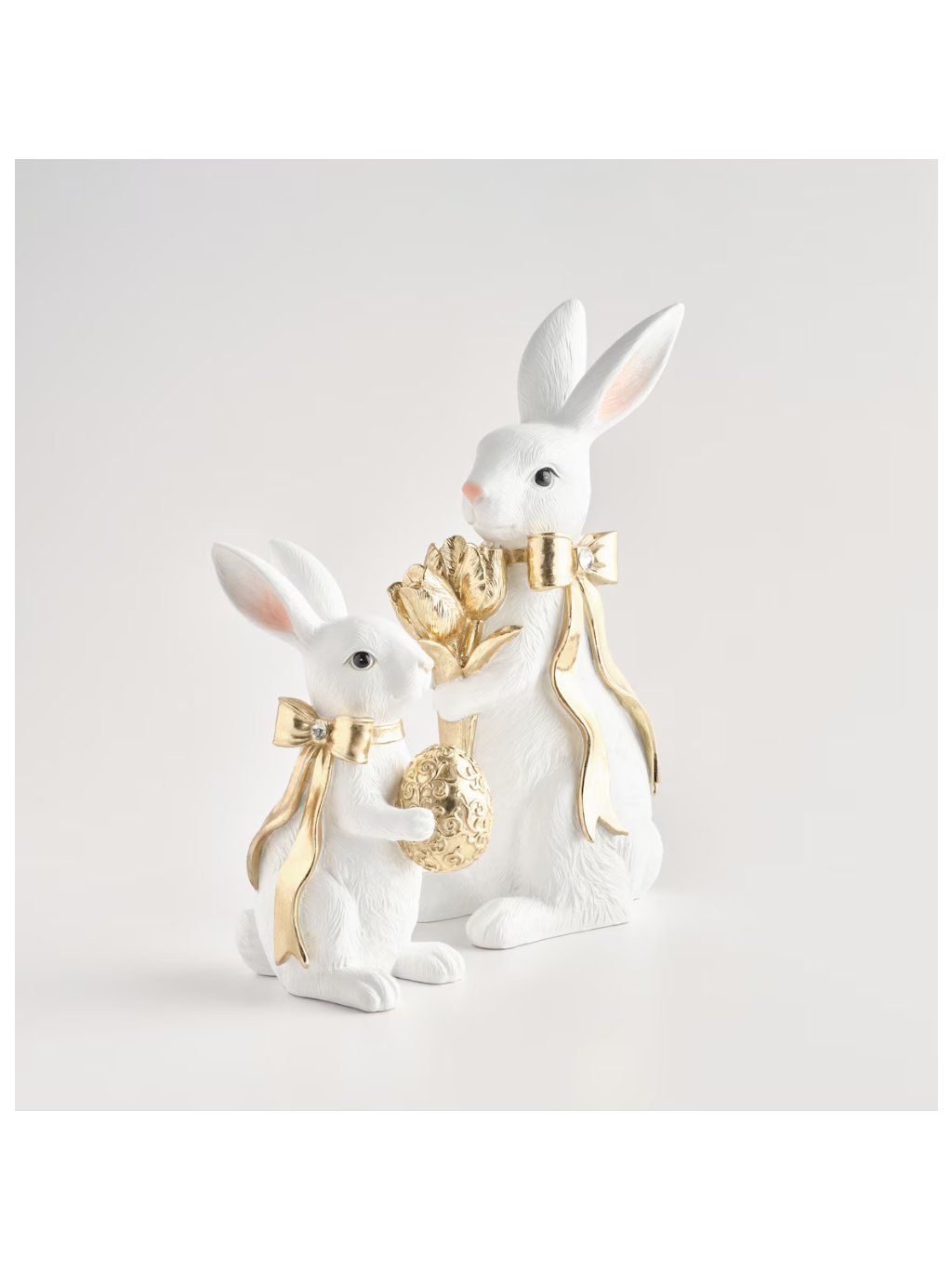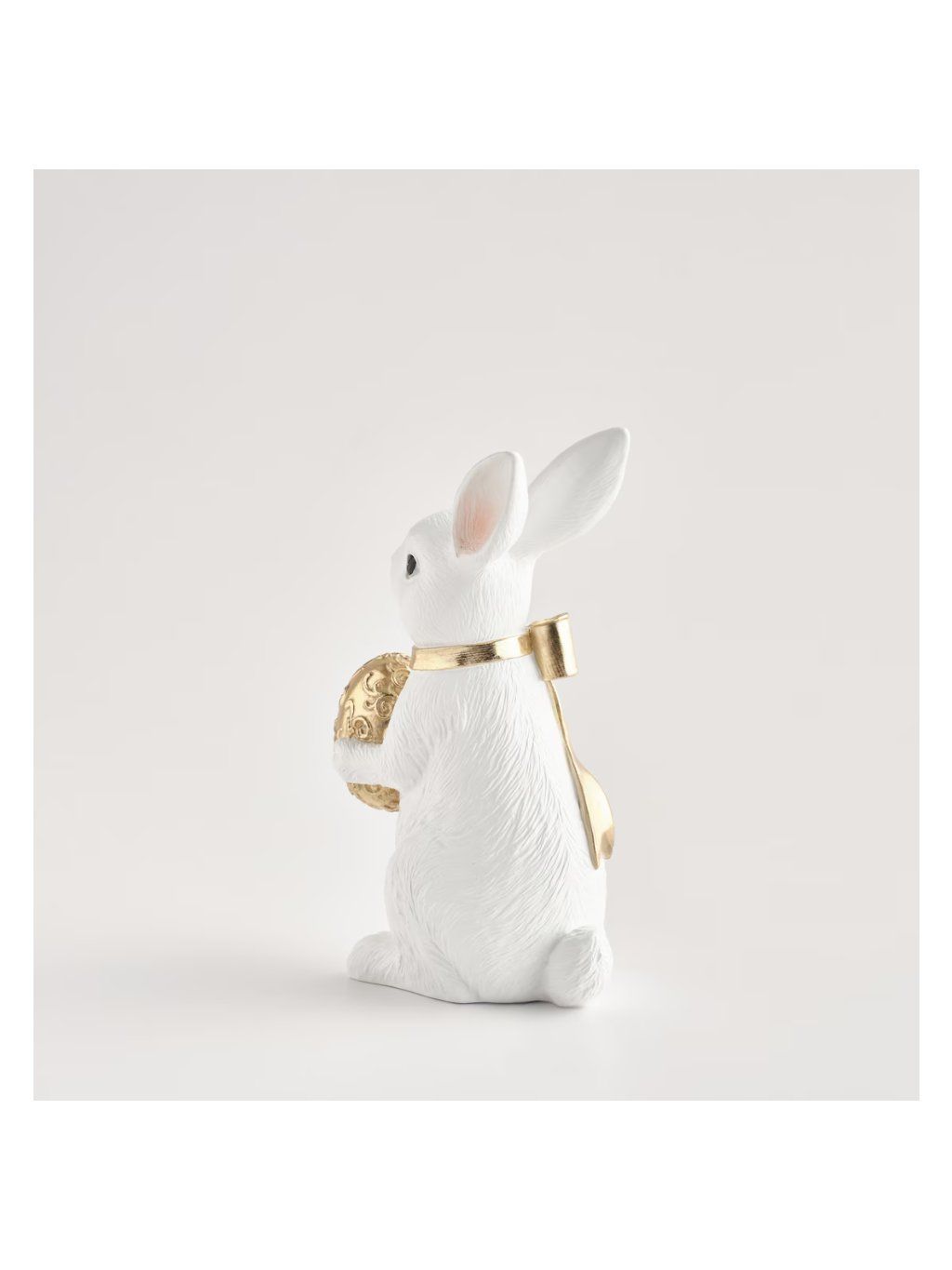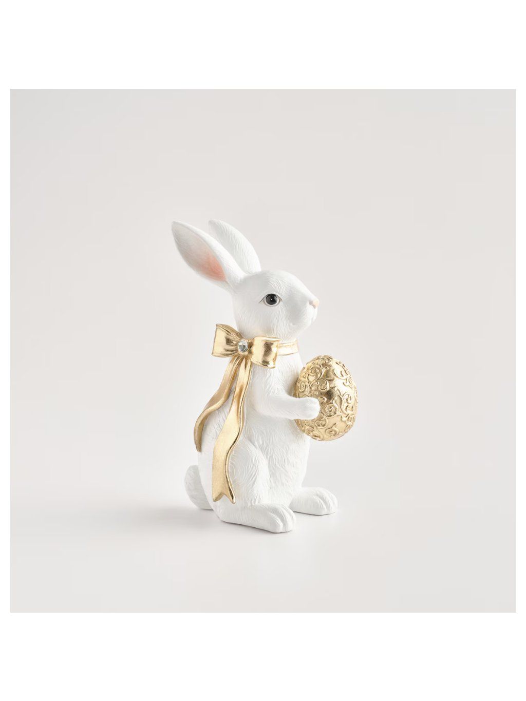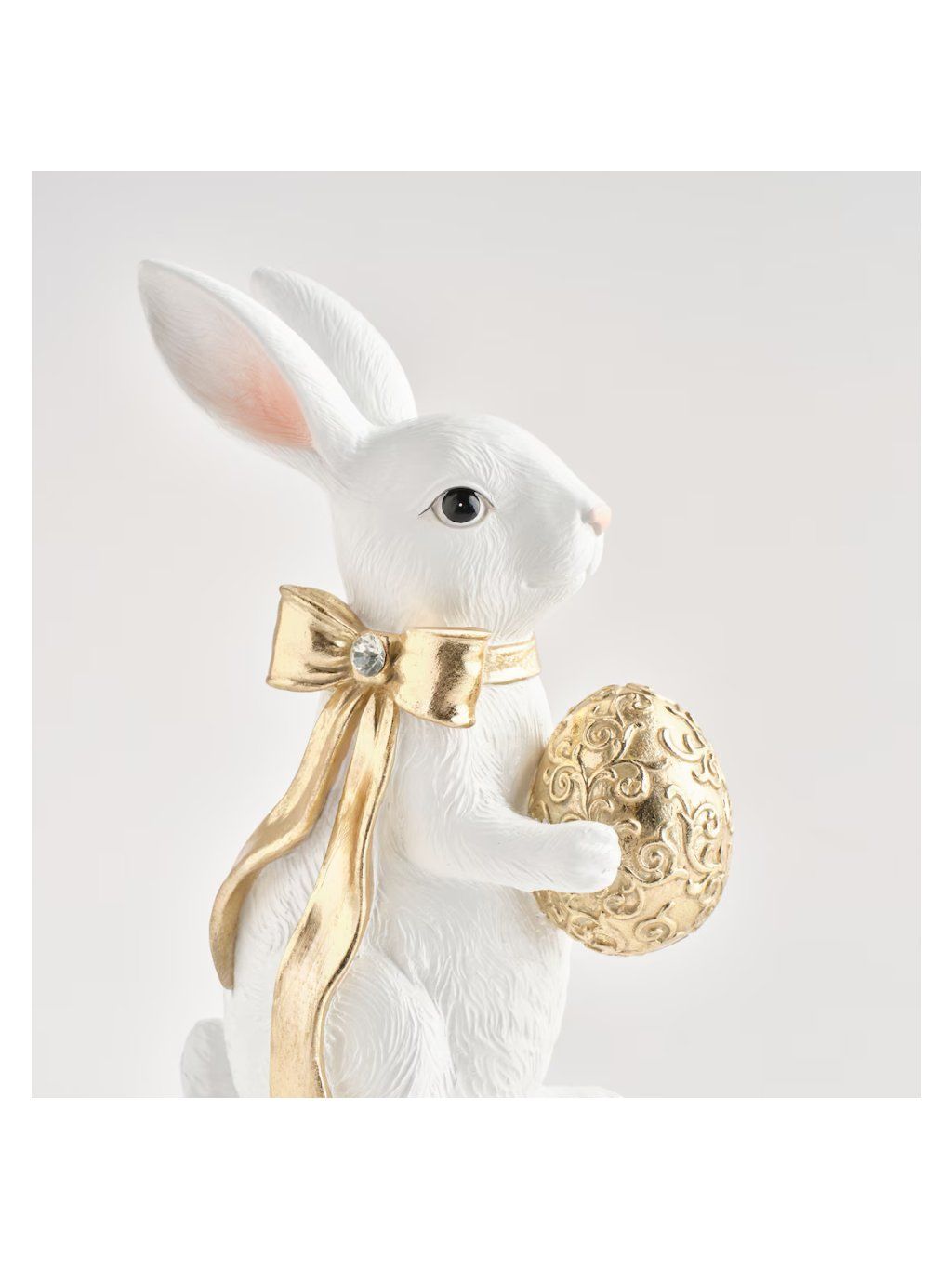 Biela farba s jemnou textúrou imitujúcou srsť králika a zlaté akcenty – mašľa s kamienkom a zdobené vajíčko – dodávajú figúrke neopakovateľný charakter. Táto štýlová dekorácia dokonale zapadne do moderných, glamour aj elegantných aranžmánov, a to nielen počas veľkonočného obdobia. Figúrka George s motívom králika je tiež skvelým tipom na darček pre osoby, ktoré si cenia originálne doplnky a vycibrený dizajn.