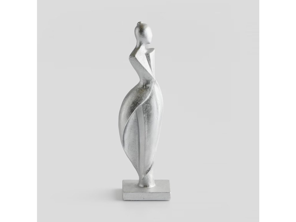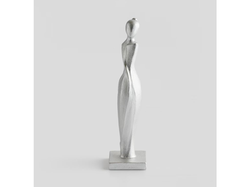 Minimalistická ženská silueta je udržiavaná v jednotnom, striebornom odtieni, s decentnou textúrou pripomínajúcou brúsený kov. Figúra spočíva na obdĺžnikovom, vyváženom podstavci, čo celku dodáva vizuálnu stabilitu. Zaoblené línie a jemné prelisy dodávajú tejto forme život, zatiaľ čo odrazy svetla podčiarkujú jej dynamickosť. Figúrka dokonale dopĺňa priestory obývačiek, spální či kancelárií – a to tak v loftových, ako aj klasických, minimalistických a moderných aranžmánoch. Tento dekoračný akcent sa radí do histórie dizajnu, vsádzajúc na harmonickú jednoduchosť a expresiu tvaru.