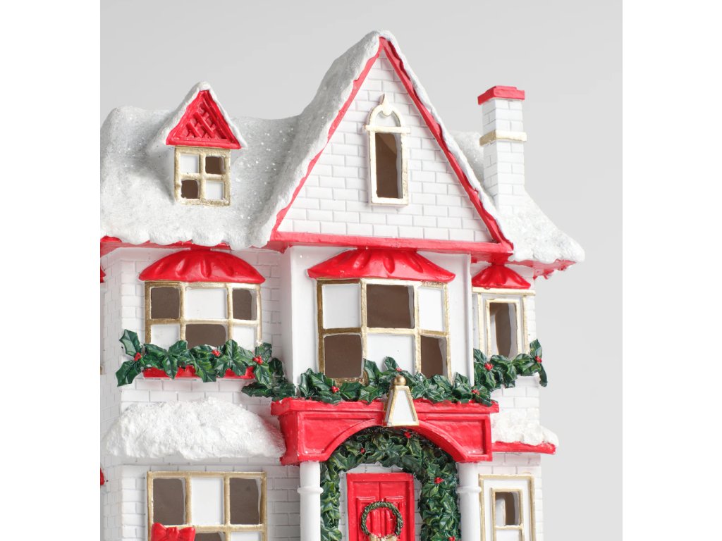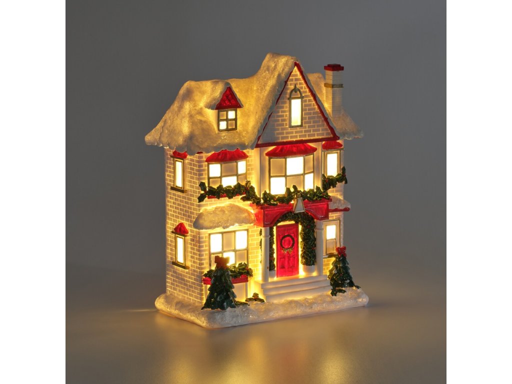 Táto veľká LED figúrka domčeka zo živicovej hmoty (výška 28.5 cm) je prepracovaná do najmenšieho detailu. Svojím tradičným dizajnom a tmavou béžovou farbou s lesklým povrchom dokonale imituje zasneženú chalúpku. Teplé LED svetlo presvitá oknami a vytvára útulnú a slávnostnú atmosféru. Jednoduché napájanie pomocou 2 AA batérií umožňuje umiestniť domček kdekoľvek bez obmedzenia káblom. Perfektný dominantný prvok pre váš vianočný krb, parapet alebo stôl.