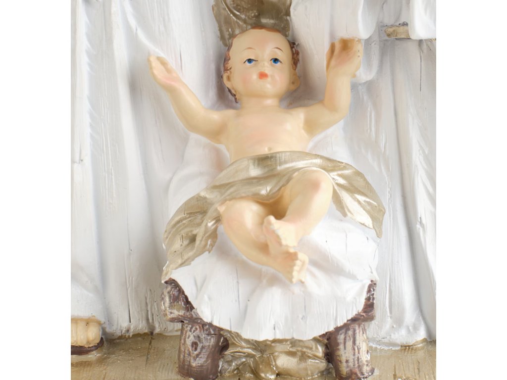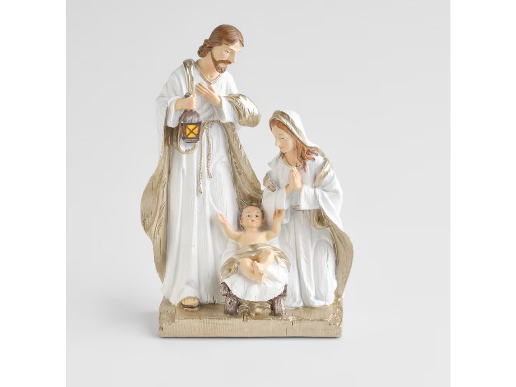 Elegantná zlatá figúrka Svätej rodiny prinesie do vášho domova tradičnú a slávnostnú atmosféru Vianoc. Figúrka je detailne prepracovaná z živicovej hmoty s pozlátenými detailmi a znázorňuje Máriu, Jozefa s lampášom a malého Ježiška v jasličkách. S výškou 30 cm je ideálnou dekoráciou na sviatočný stôl, komodu alebo krbovú rímsu, kde pripomína hlavný význam Vianoc.