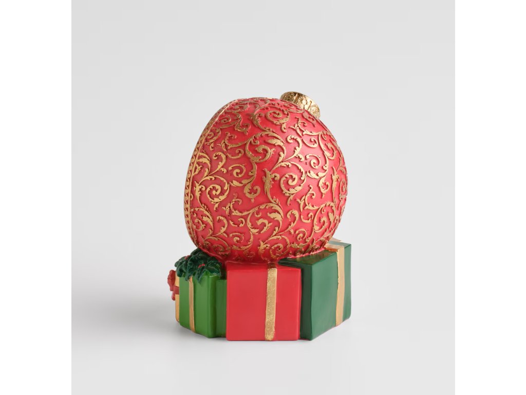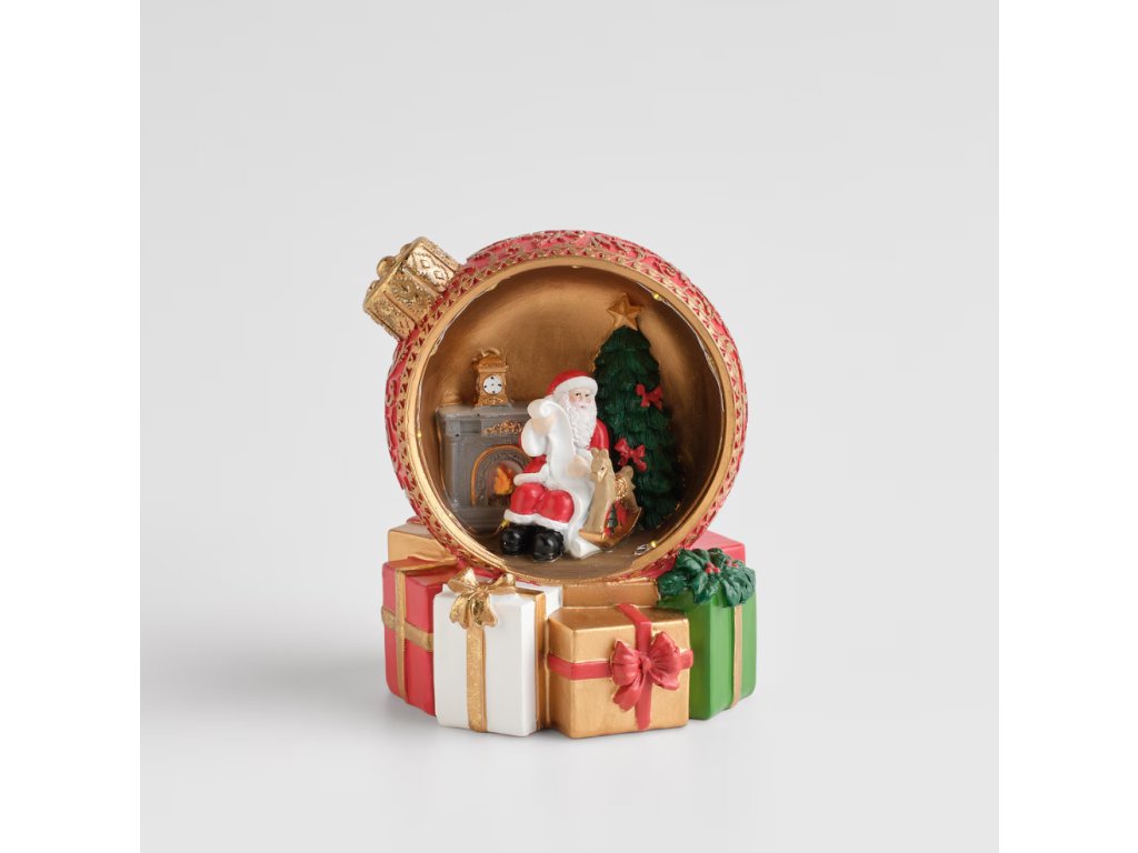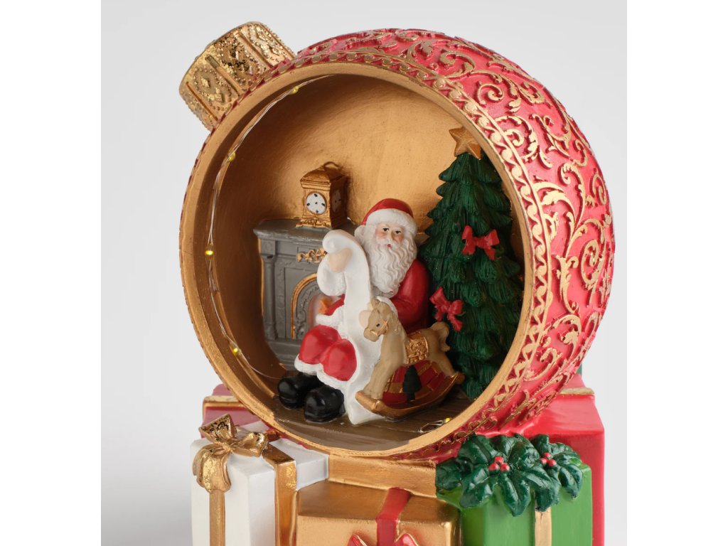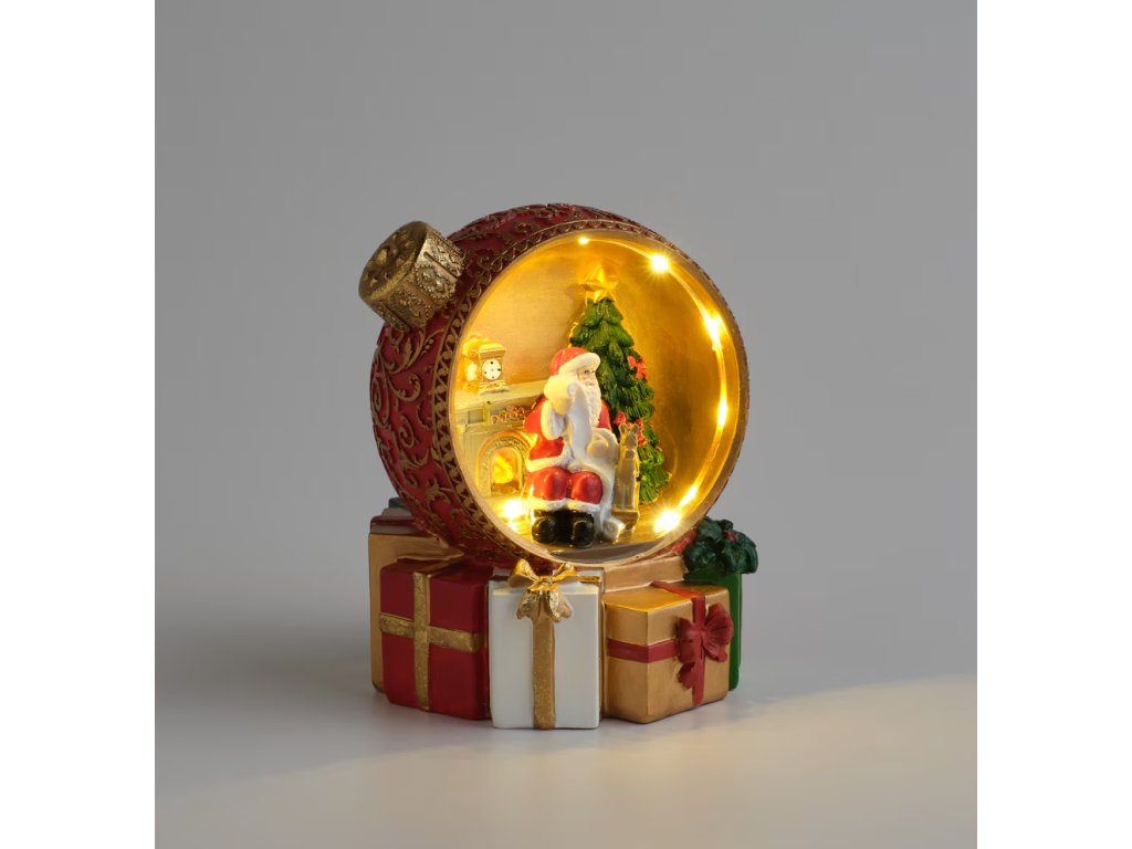 Červený, intenzívne lakovaný odtieň gule, bohaté zlaté ornamenty a vypuklé reliéfne vzory dodávajú figúrke eleganciu a umožňujú podčiarknuť sviatočnú atmosféru interiéru. Vnútro dekorácie tvorí realistická scéna s Mikulášom, sobom, vianočným stromčekom a krbom – je to neopakovateľný akcent, ktorý sa dokonale hodí tak do klasických, ako aj moderných aranžmánov. LED figúrka Santio bude vynikajúcou voľbou ako vianočný darček pre blízku osobu, ako aj ako efektná ozdoba obývačky, haly či detskej izby.