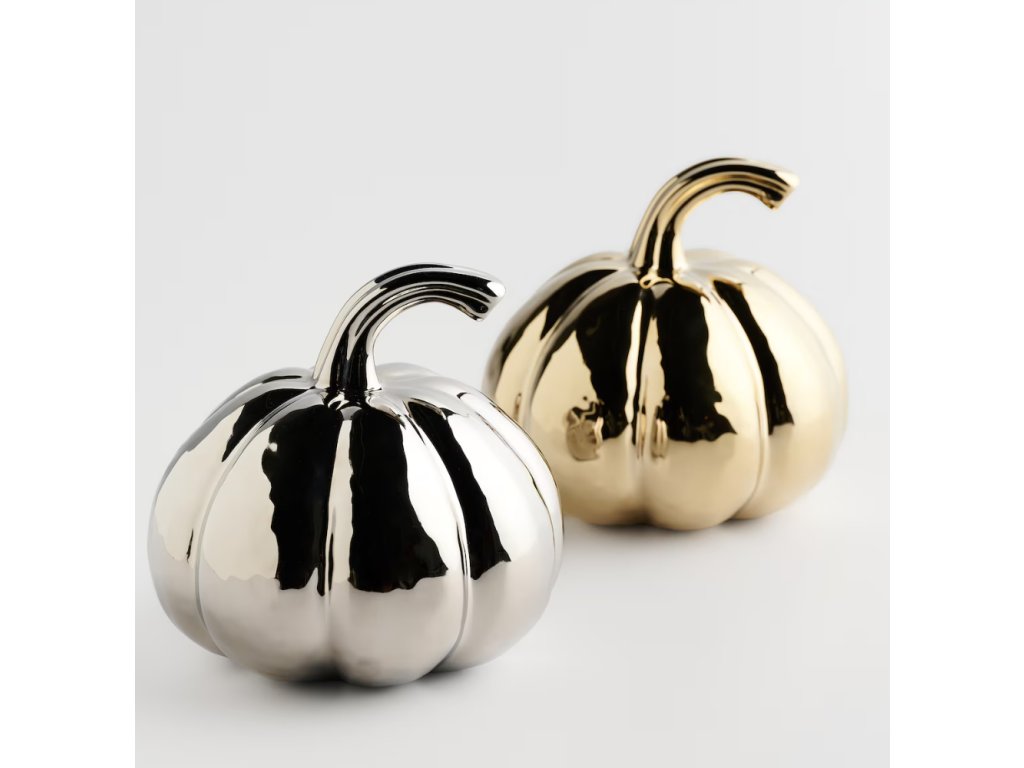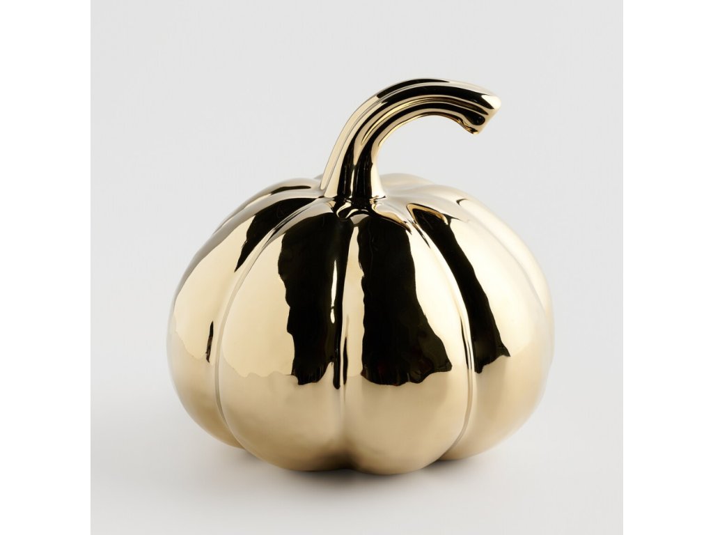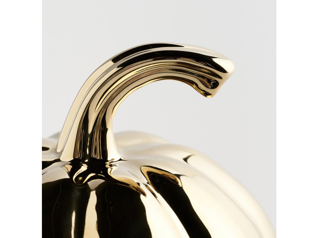 Dekoračná figúrka v tvare tekvice, vyrobená z kameniny v zlatej farbe, je štýlovým a elegantným akcentom jesennej výzdoby interiéru. Jej metalický povrch dodáva priestoru jedinečný lesk a pevné spracovanie zaručuje dlhú životnosť a stabilitu. Je ideálna ako ozdoba na stôl, policu alebo komodu, vnesie teplú, sezónnu atmosféru a dokonale ladí s rôznymi interiérovými štýlmi.