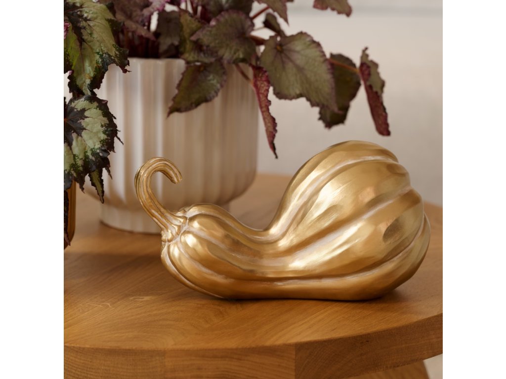 Očarujúca dekoračná figúrka v tvare tekvice je skvelou voľbou pre milovníkov elegantných interiérových doplnkov. Je vyrobená zo živicovej hmoty v zlatom odtieni a spája v sebe lesk a prepracovanosť. Vďaka jej rozmerom dokonale vynikne na poličke, komode alebo stolíku, čím dodá priestoru nádych luxusu a štýlu. Táto zlatá tekvica nie je len dekoračným prvkom, ale aj jedinečným detailom, ktorý vnesie teplý a elegantný akcent do každého interiéru.