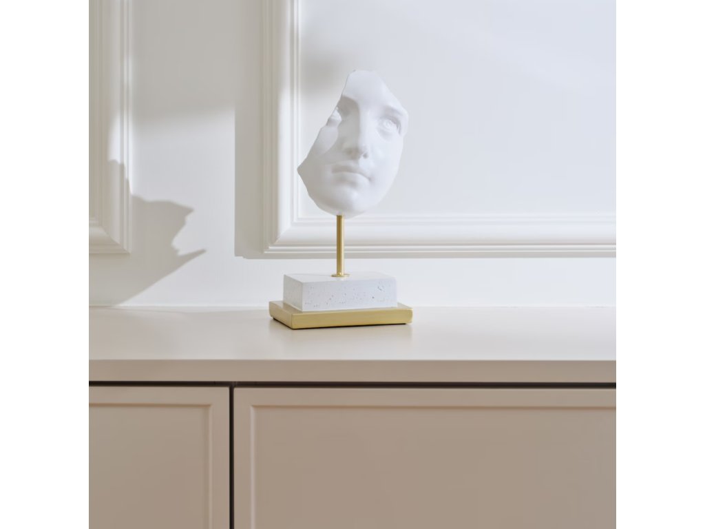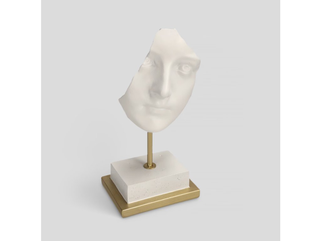Biely fragment tváre vytvára jemný, ale výrazný akcent, ktorý zdôrazňuje zlatá kovová základňa a obdĺžnikový stojan. Socha priťahuje pohľady svojou jemnou textúrou a realistickým stvárnením čŕt. Vnáša nádych moderného umenia do minimalistického, škandinávskeho aj nadčasového interiéru a jej nezvyčajná forma inšpiruje k vytváraniu vlastných interiérových príbehov. Skvele sa vyníma na polici, pracovnom stole, komode či konferenčnom stolíku, a je tiež ideálnym darčekom s posolstvom a charakterom.