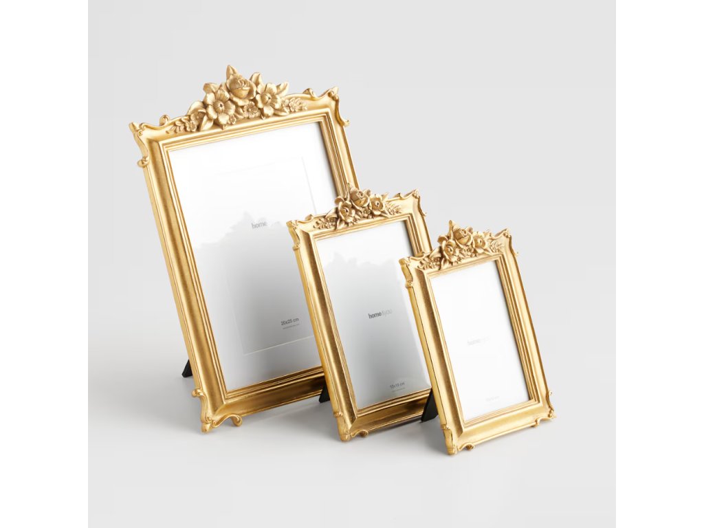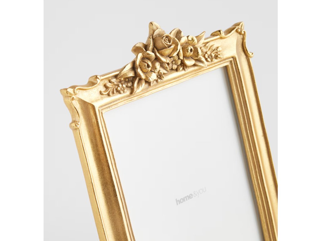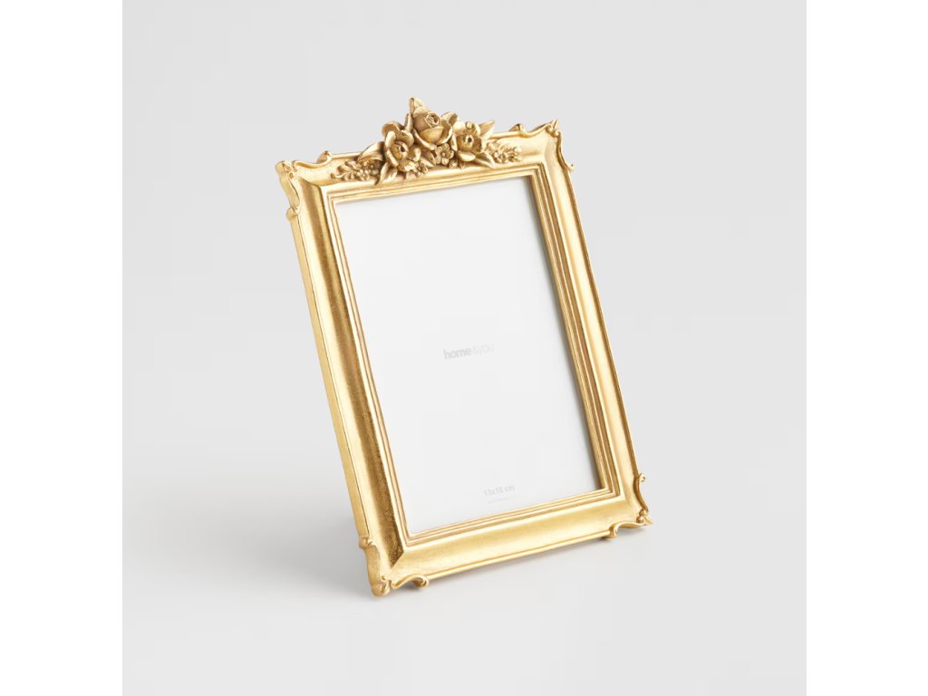 Elegantný rám vyrobený z trvácnej živicovej hmoty v efektnom, zlatom vyhotovení. Určený na jednu fotografiu vo formáte 13 x 18 cm, dokonale podčiarkuje výnimočný charakter fotografie. Klasický dizajn s jemnými zdobeniami ho robí ideálnym pre interiéry v štýle glamour, vintage, ako aj klasickom. Môže byť postavený na poličke, komode alebo na stole. Dodá lesk každej miestnosti a zvýrazní cenné spomienky.