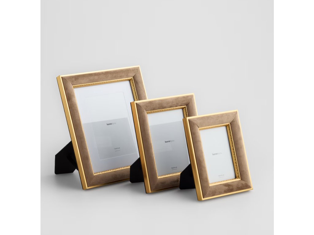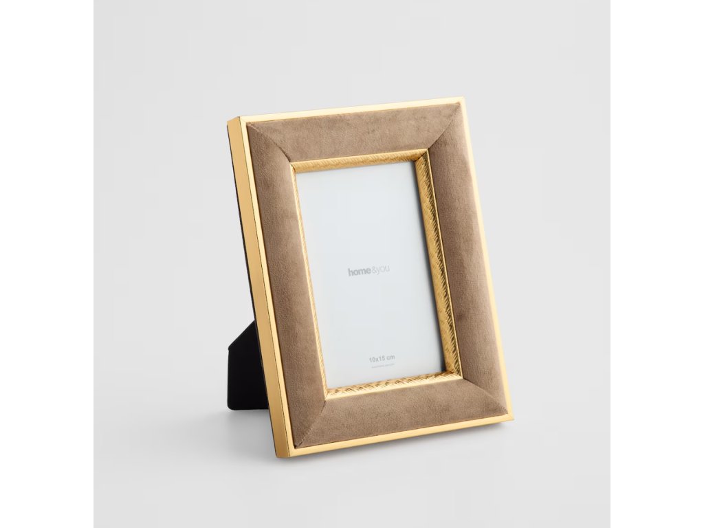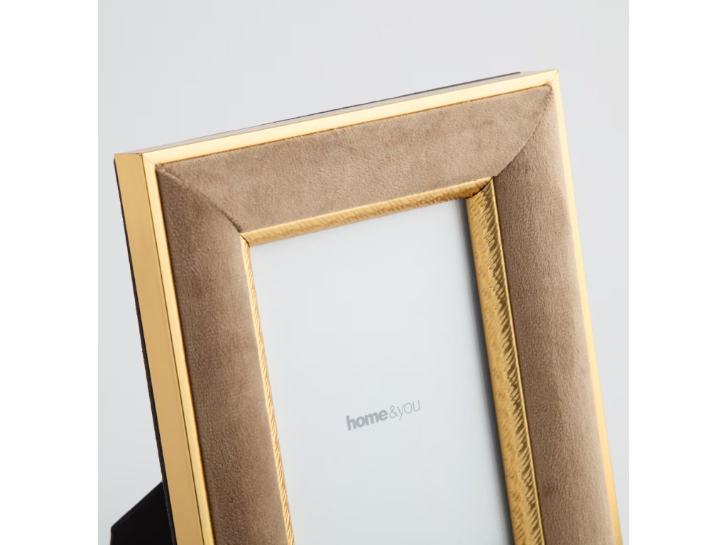 Fotorámik Lingoso vnesie do vášho interiéru dotyk luxusu a elegancie. Je určený pre fotografie s rozmermi 10x15 cm a kombinuje teplý béžový odtieň s lesklým zlatým lemovaním, ktoré zvýrazňuje jeho sofistikovaný štýl. Rám je potiahnutý jemným velúrom (velvet), čo mu dodáva príjemnú textúru. Vyrobený je z MDF a skla. Vďaka svojej hladkej povrchovej úprave sa hodí do moderných aj klasických elegantných aranžmánov.