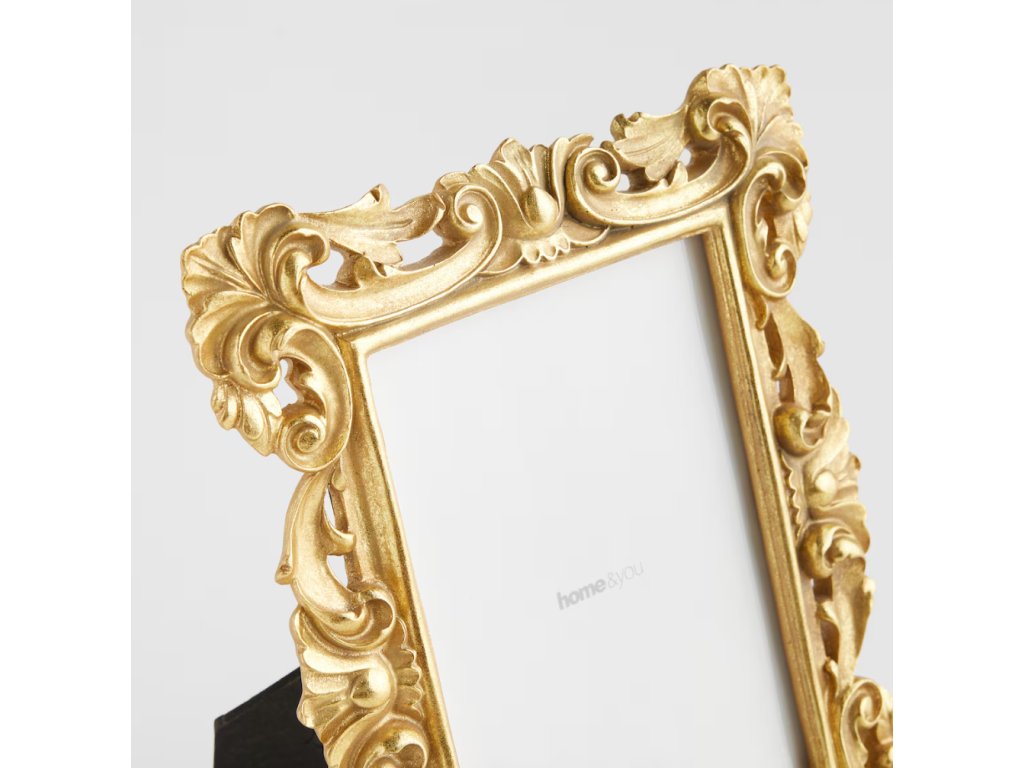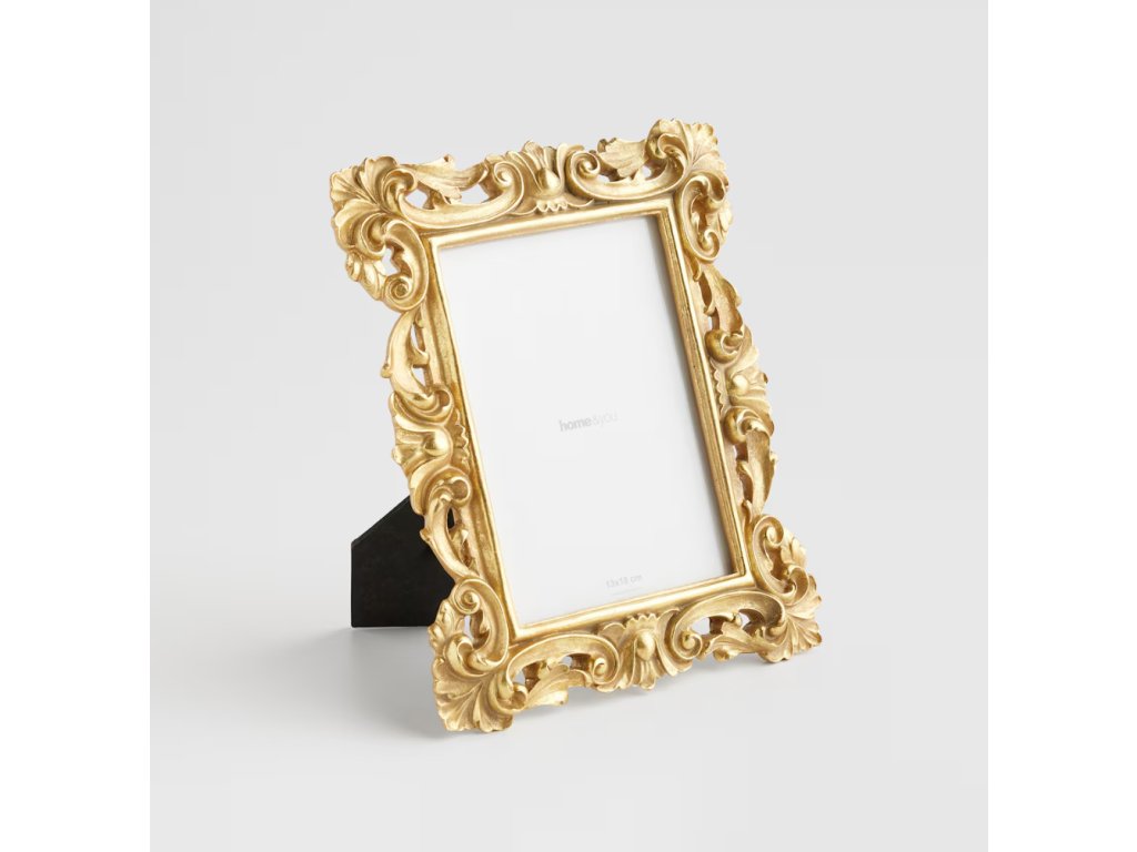 Elegantný rámik vyrobený z trvácnej živicovej hmoty v efektnom, zlatom vyhotovení. Určený na jednu fotografiu vo formáte 13 x 18 cm, dokonale podčiarkuje výnimočný charakter fotografie. Unikátny dizajn s jemným zdobením zaručuje, že sa ideálne hodí tak do interiérov v štýle glamour, vintage, ako aj klasickom. Môže byť postavený na poličke, komode alebo písacom stole, dodá lesk každej miestnosti a vystaví cenné spomienky.