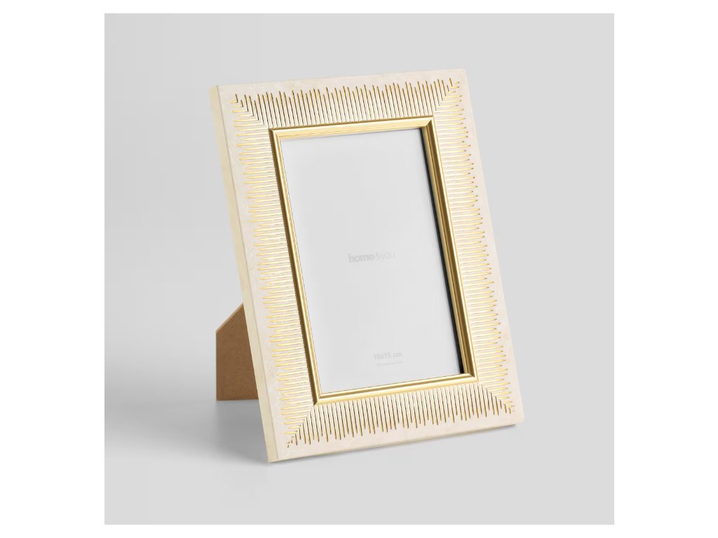 Zlatý fotorámik pre fotografiu 10x15 cm je štýlovým a elegantným doplnkom do každého interiéru. Rám je vyrobený z MDF dosky, s ochranným sklom a má béžový okraj s detailnou textúrou pripomínajúcou mramor so zlatými, radiálnymi ryhami. Jeho elegantný a zdobený štýl je perfektný na vystavenie dôležitých spomienok na stole, komode alebo poličke.