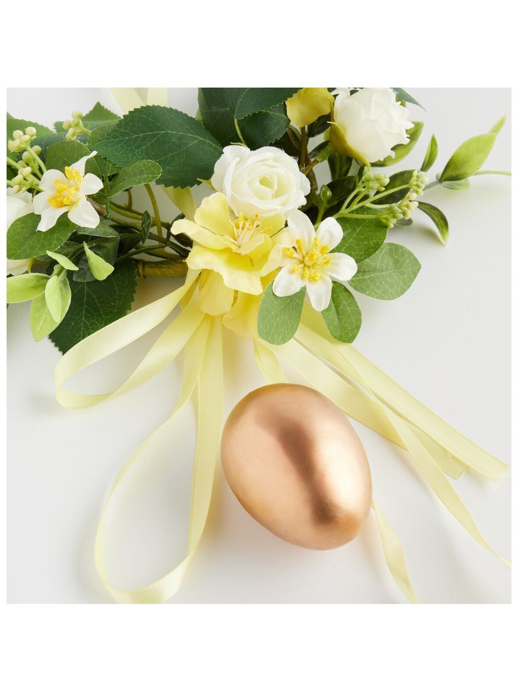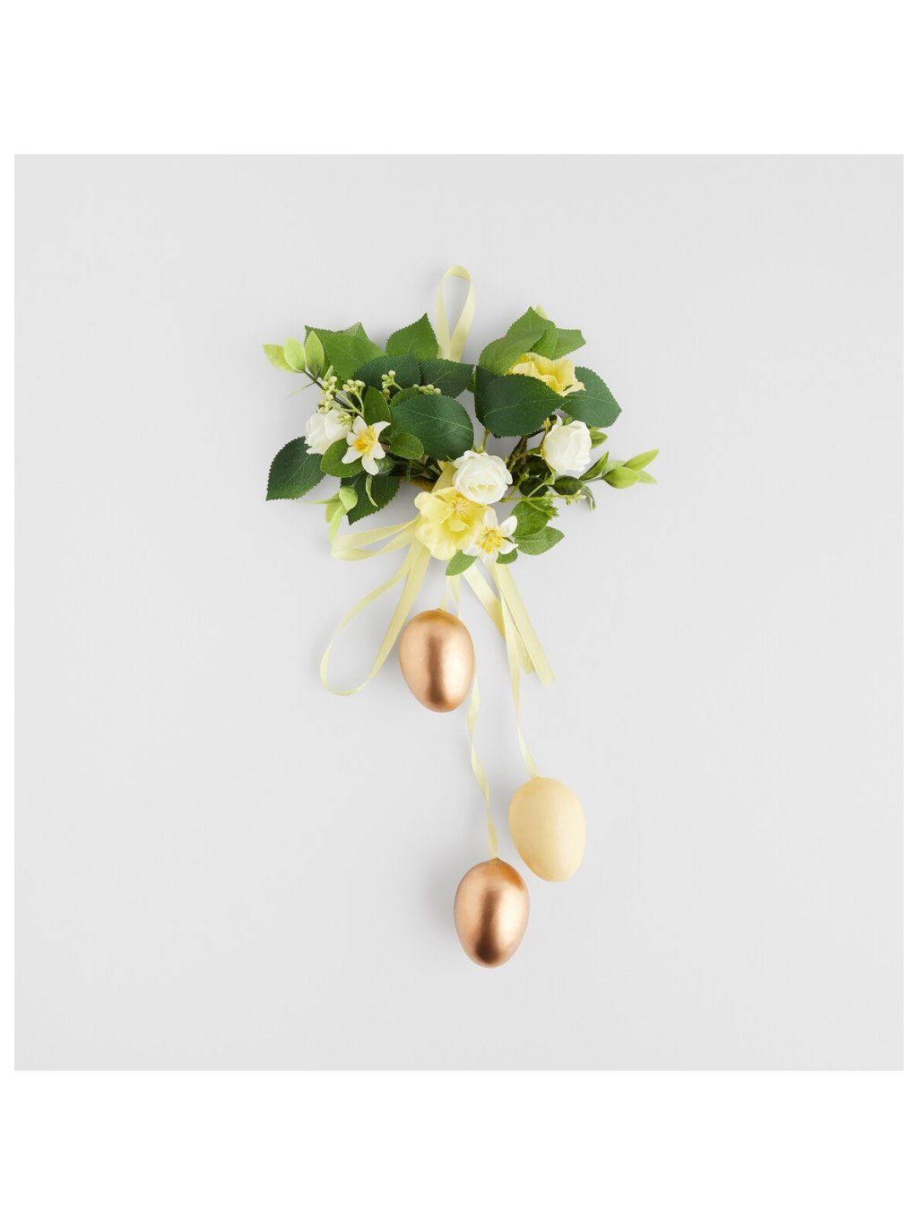 Girlanda Luniva očarí tradičným jarným dizajnom. Kombinácia bielych a žltých kvetov, listov s bohatou štruktúrou a dekoračných vajíčok – v odtieňoch zlata a pastelovej žltej – vytvára neopakovateľnú kompozíciu. Svetložlté saténové stuhy dodávajú ľahkosť a celok krásne vynikne ako nástenná ozdoba, na stole alebo v okne. Ide o nadčasovú veľkonočnú dekoráciu a štýlový prvok pre čas jarných stretnutí, ktorý sa dokonale hodí do klasických aj moderných interiérov a poslúži aj ako skvelý tip na darček.