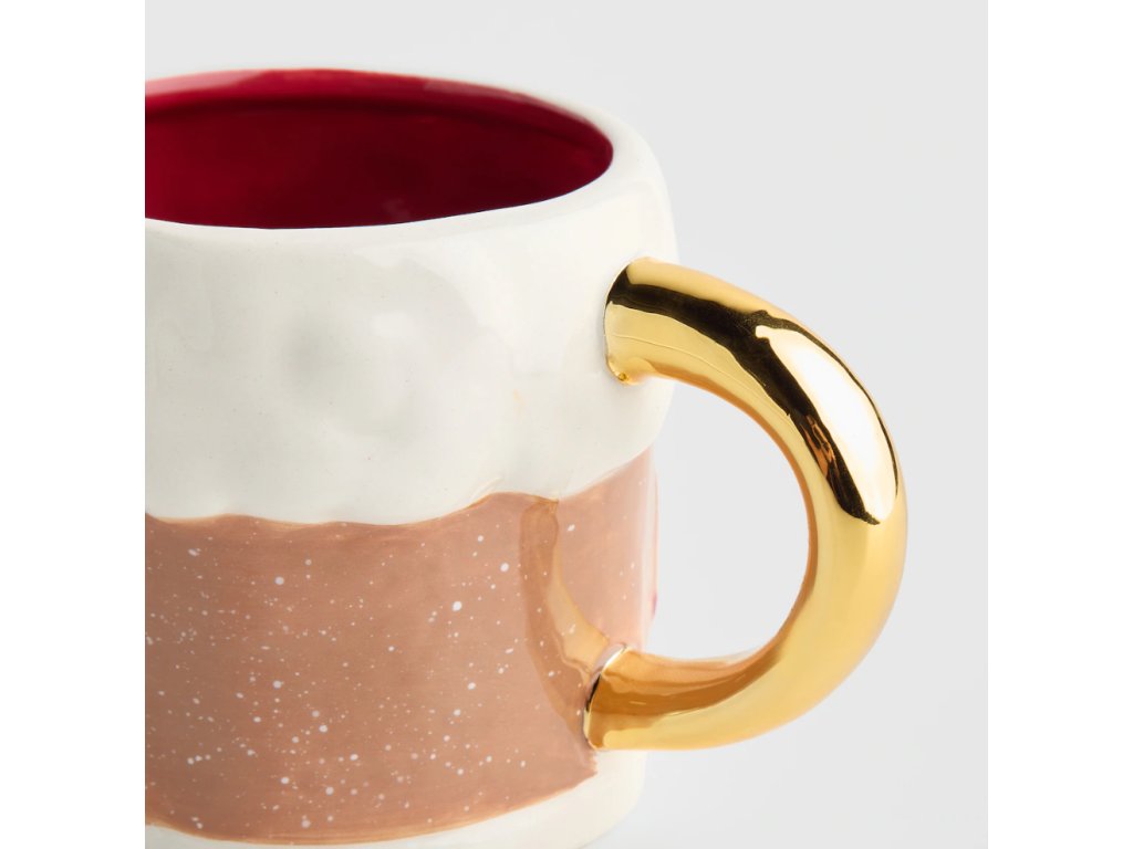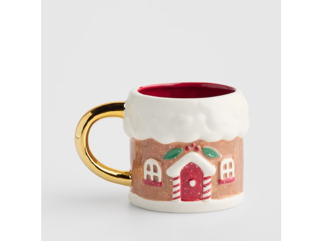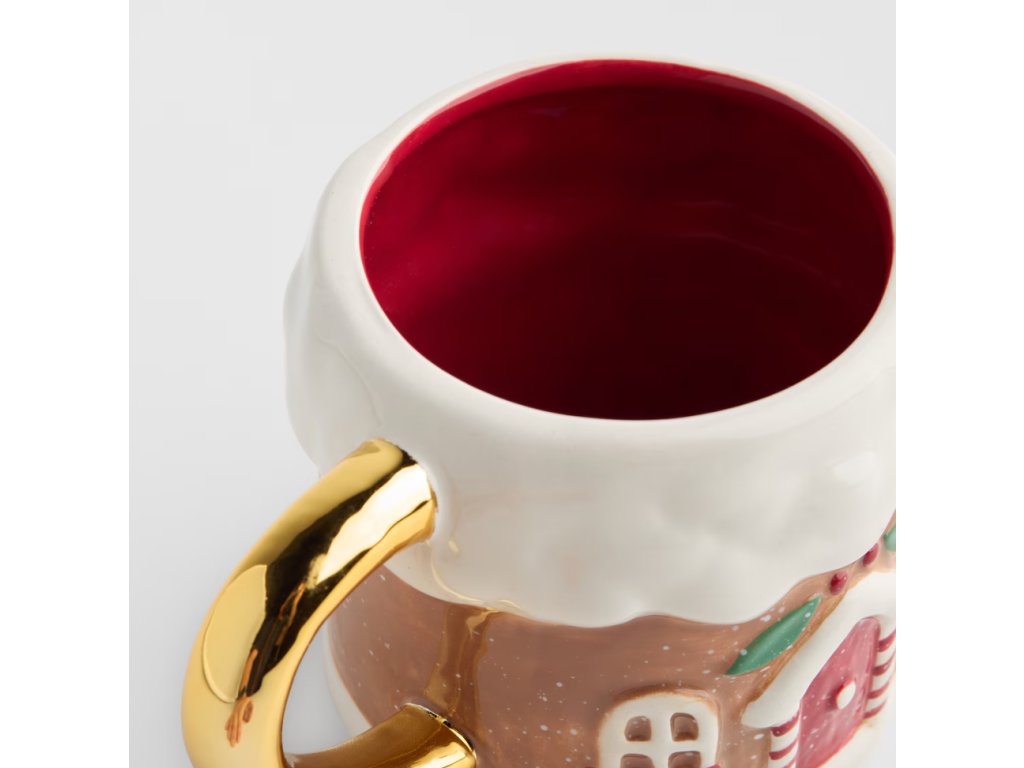 Vychutnajte si horúce vianočné nápoje z tohto rozkošného hrnčeka, ktorý vnesie do vášho stolovania teplo a kúzlo. Hrnček je vyrobený z kvalitného dolomitu a je ručne dekorovaný tak, aby verne imitoval medovníkový domček. Má detailnú hnedú fasádu zdobenú bielou polevou, oknami s cukrovou námrazou a červenými dverami. Horná časť je vytvarovaná ako zasnežená strecha, vďaka čomu pôsobí objemným 3D efektom. Luxusný akcent mu dodáva lesklé zlaté ucho. Hrnček s objemom 450ml sa skvele hodí k tradičnému štýlu sviatočného prestierania a je neodolateľným spoločníkom na dlhé zimné večery.