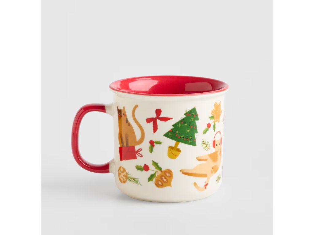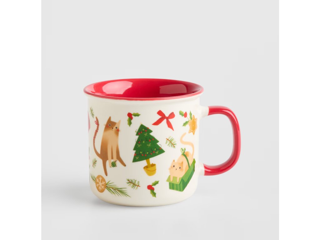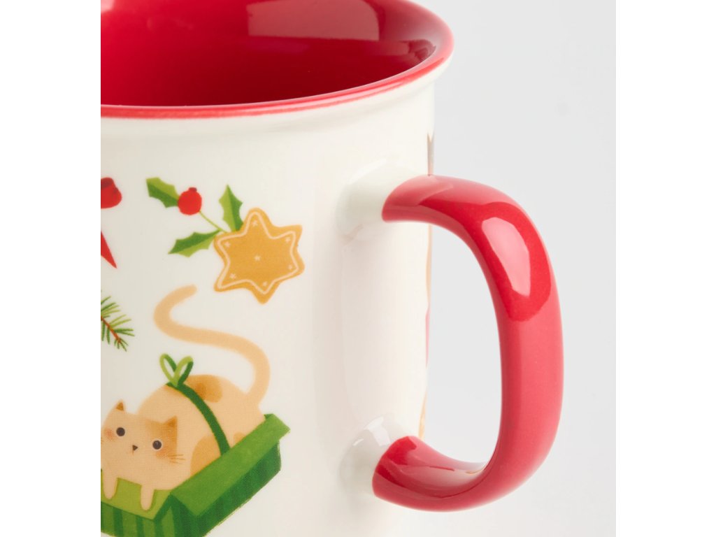 Rozkošný dizajn hrnčeka s motívom vianočných mačiek, vianočného stromčeka, darčekov a vetvičiek cezmíny sa skvele hodí do vianočnej atmosféry. Dominujúca biela v kombinácii s červeným vnútrom a uchom vytvára klasickú, sviatočnú kompozíciu. Hrnček Miaoumas bude ideálnym doplnkom k sviatočnému stolu, ako aj roztomilým darčekom pre milovníkov mačiek a sviatočnej atmosféry.