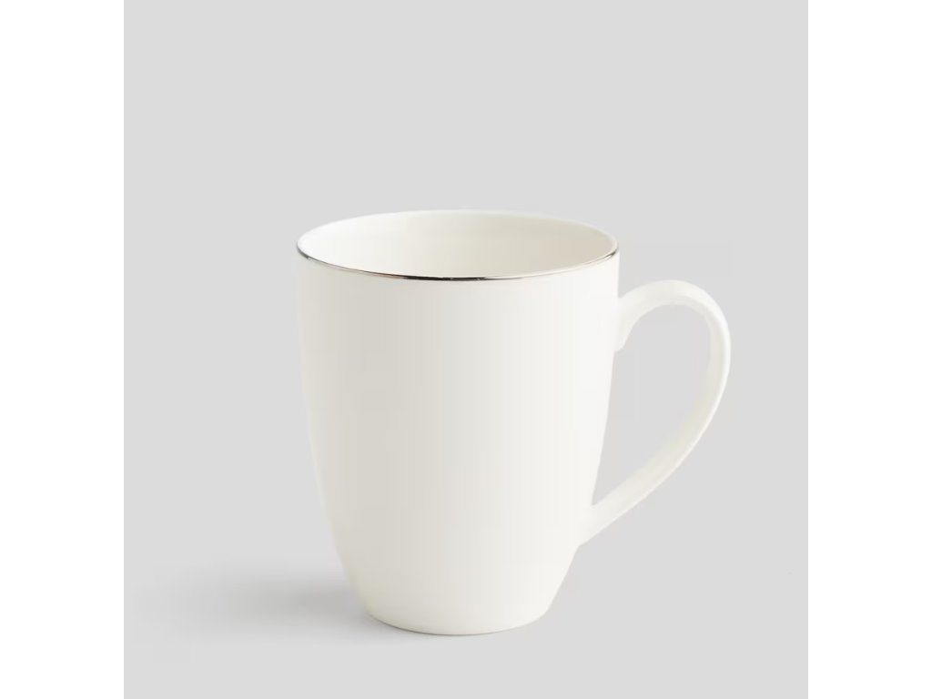 Hrnček z porcelánu v bielej farbe so strieborným okrajom je elegantným doplnkom každého riadu. Jeho jednoduchý, no nadčasový dizajn s decentnou striebornou úpravou zaručuje, že sa dokonale hodí tak na každodenné, ako aj formálne príležitosti. Je ideálny na pitie kávy, čaju či iných nápojov a spája funkčnosť s estetikou.