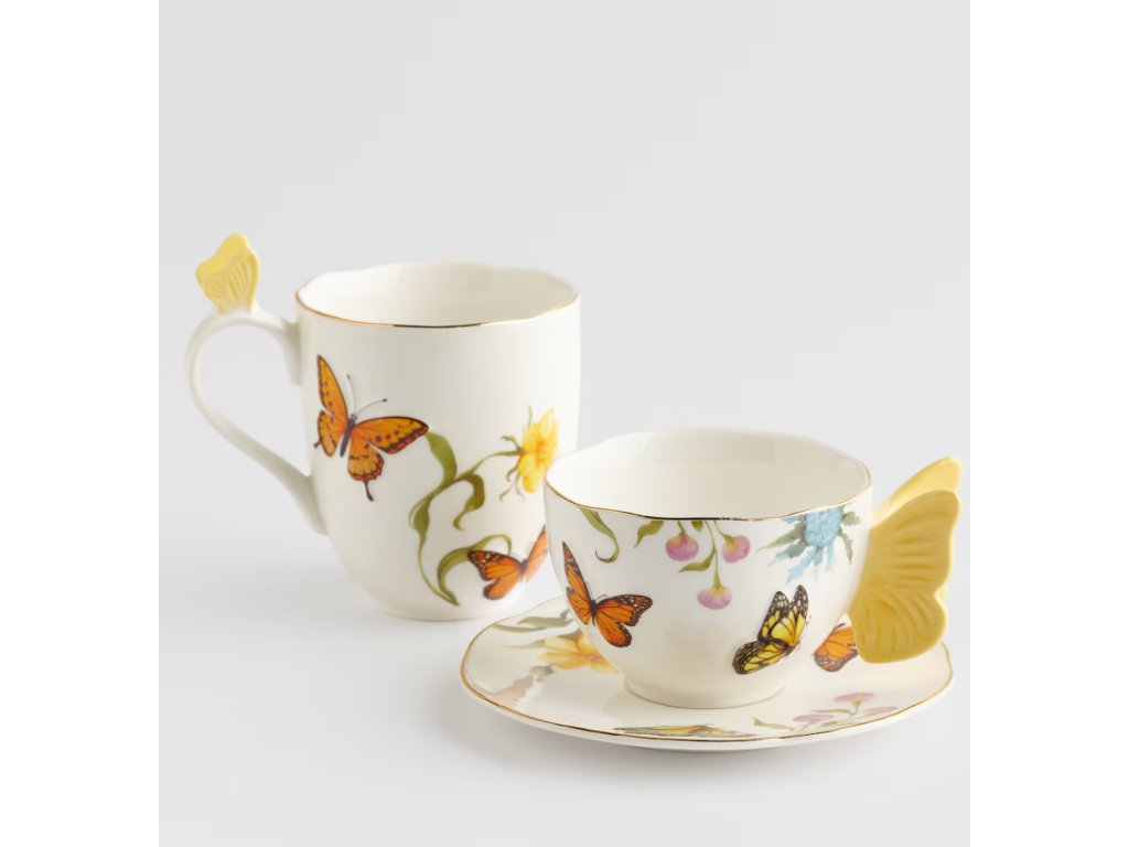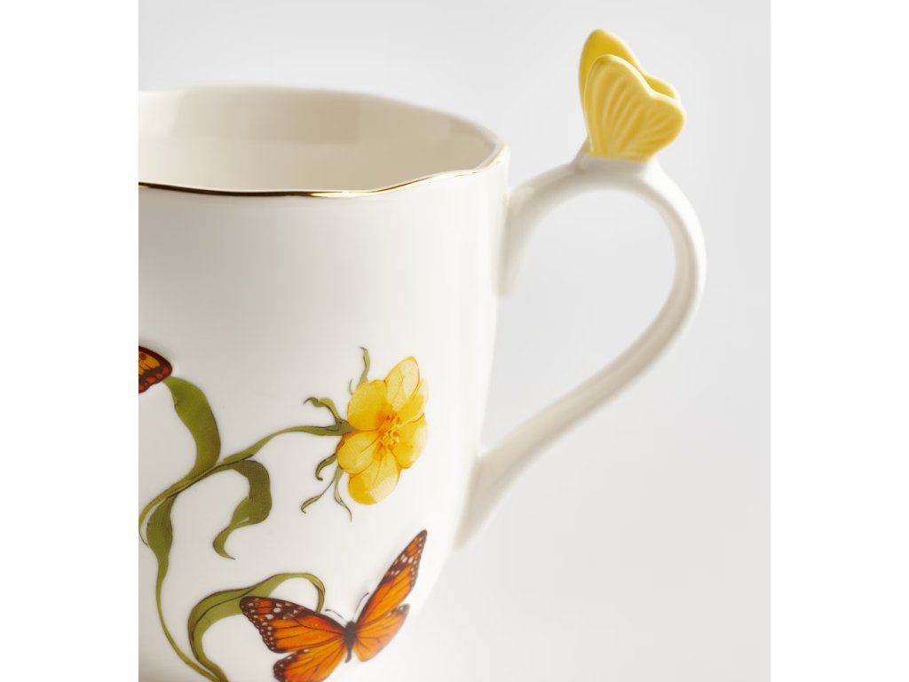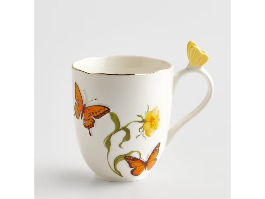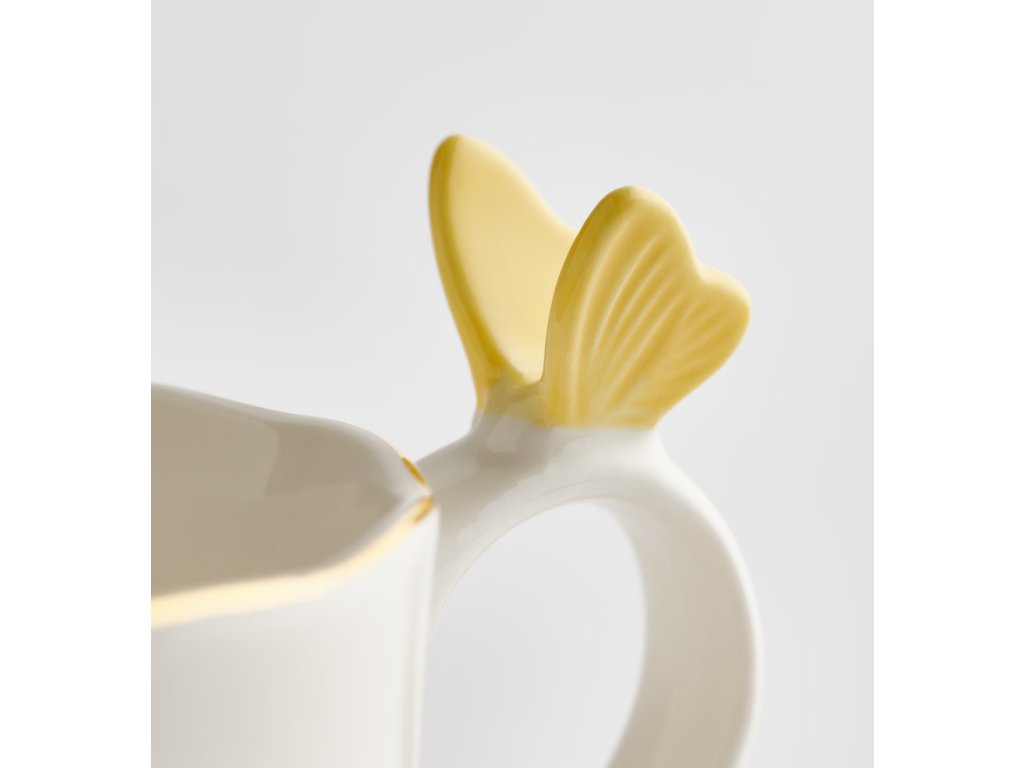 Jemný hrnček z porcelánu, zdobený krásnym motívom motýľov. Je ideálny na každodenné použitie, na kávu, čaj alebo iné obľúbené nápoje. Decentné zdobenie mu dodáva ľahkosť a jedinečný pôvab, vďaka čomu sa každý dúšok stane pôžitkom.