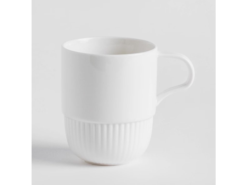 Univerzálna, biela farba s matným, hladkým vrchom a elegantným, vertikálnym žliabkovaním na spodnej časti odráža zdržanlivú estetiku a minimalizmus, ktoré sa uplatnia v každom interiéri – od klasického po moderný. Mierne profilované ucho a precízne vyhotovený okraj robia hrnček nielen dobre padnúcim do ruky, ale aj štýlovo pôsobiacim pri každodennom používaní. Je to vynikajúci doplnok tak do kuchyne, ako aj do kancelárie, alebo ako premyslený príležitostný darček.