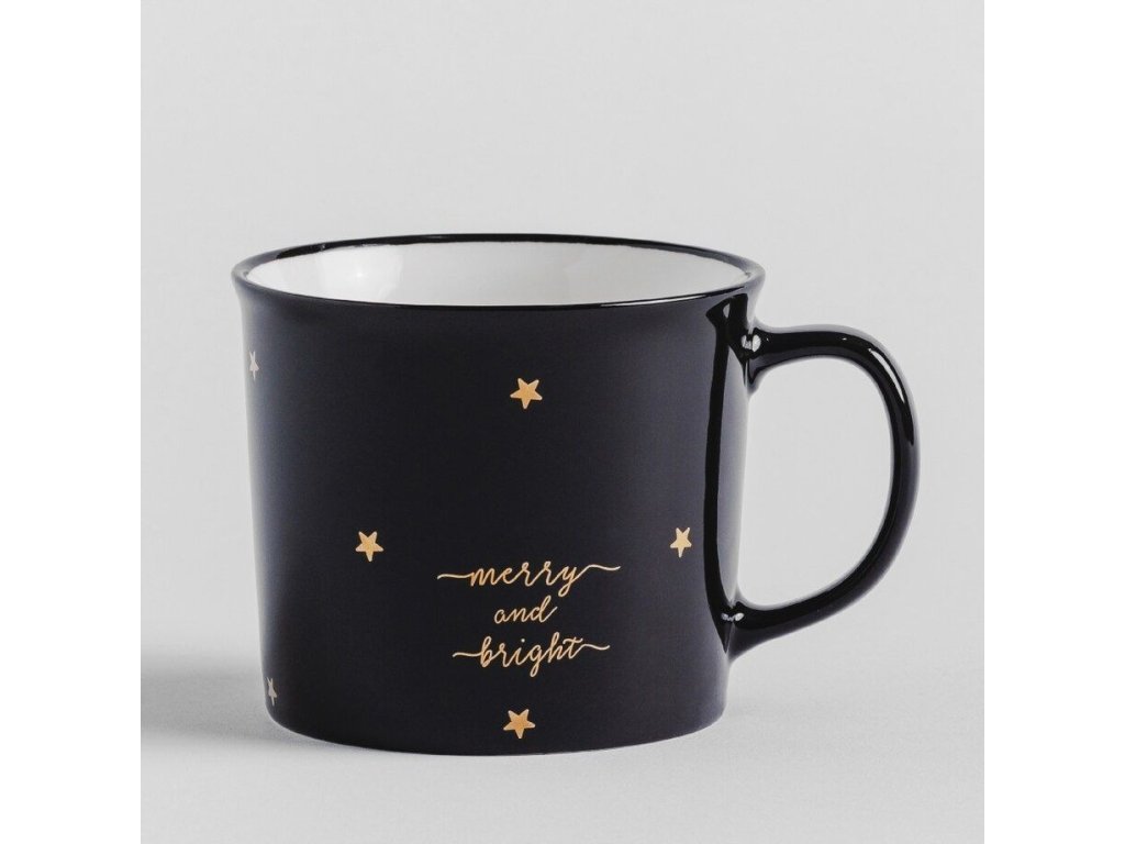 STARRENOS je vianočný hrnček. Jeho čierna farba robí produkt elegantným a všestranným. Elegantný vzor zlatých hviezdičiek a bohato zdobený nápis „merry and bright“ mu dodávajú charakter a ešte viac šiku. Vďaka klasickému výberu farieb a minimalizmu osloví široké publikum.