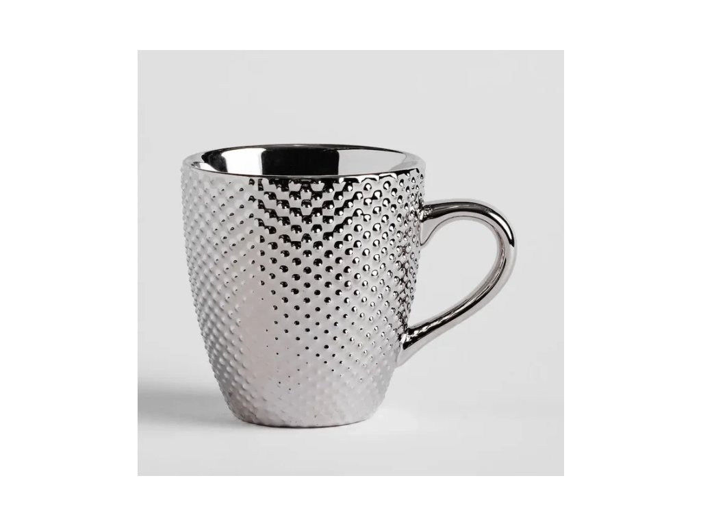 Hrnček Texture New, vytvorený v tvarovanej forme, spestrený dekoratívnou textúrou vypuklých bodiek a obohatený o atraktívny strieborný odtieň, bude určite skvele vyzerať ako prvok interiérového dizajnu nášho domova a samozrejme bude užitočný pri každodennom používaní.