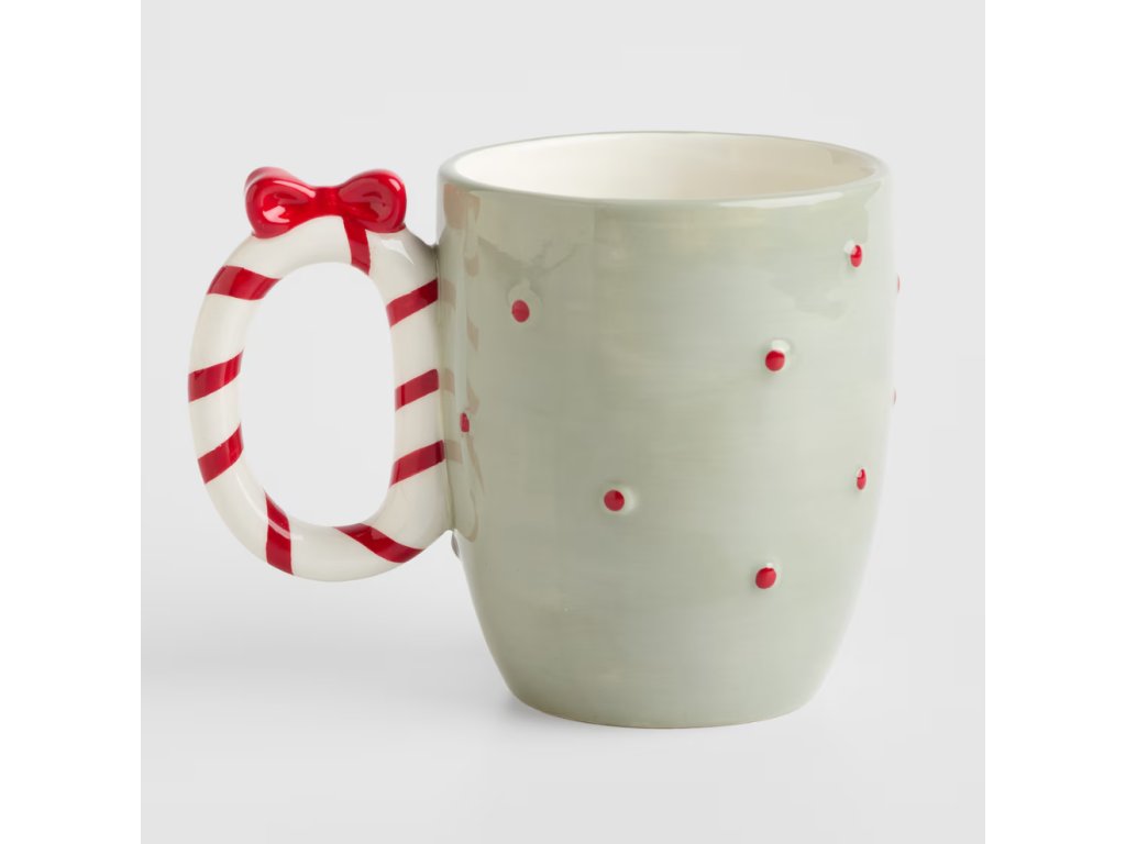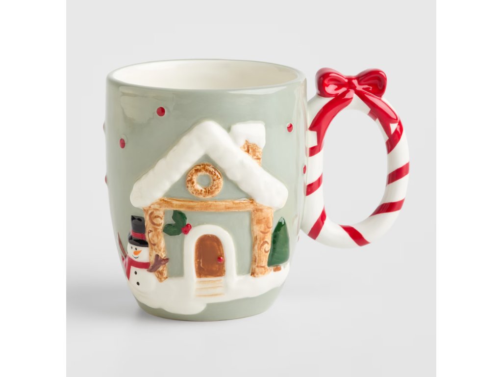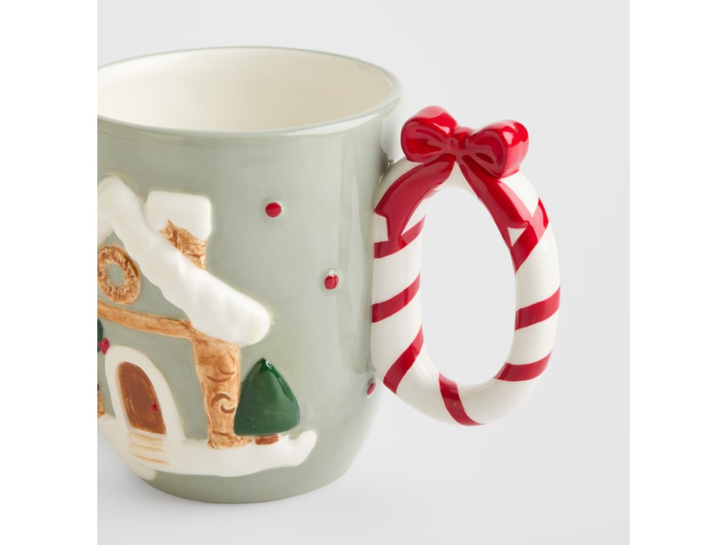 Veselý vianočný hrnček s reliéfnym motívom zasneženého perníkového domčeka a snehuliaka je dokonalým doplnkom pre sviatočnú pohodu. Hrnček je zhotovený z ručne dekorovanej dolomitovej keramiky a má svetlozelenú farbu. Jeho originálne ucho v tvare červeno-bielej cukrovej paličky s červenou mašľou dodáva tomuto kusu hravý a rozprávkový vzhľad, ideálny na horúcu čokoládu alebo vianočný čaj s objemom 500 ml.