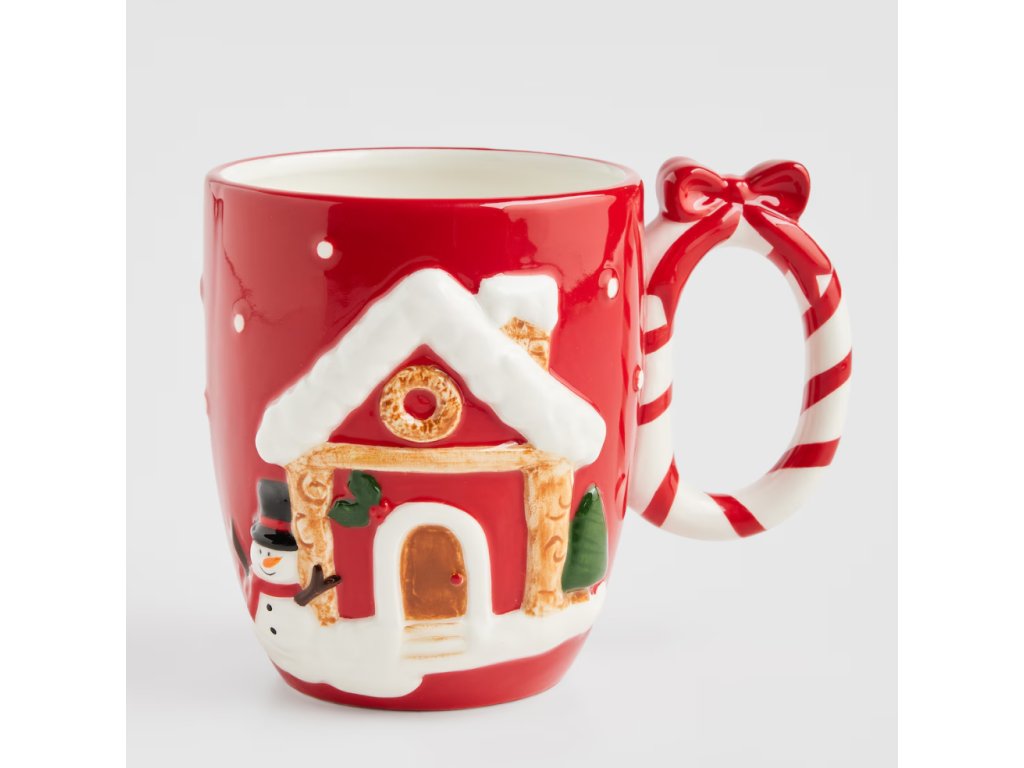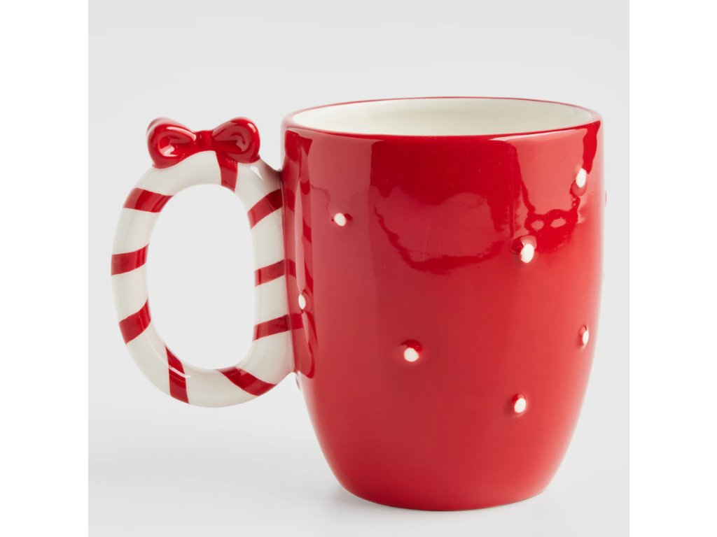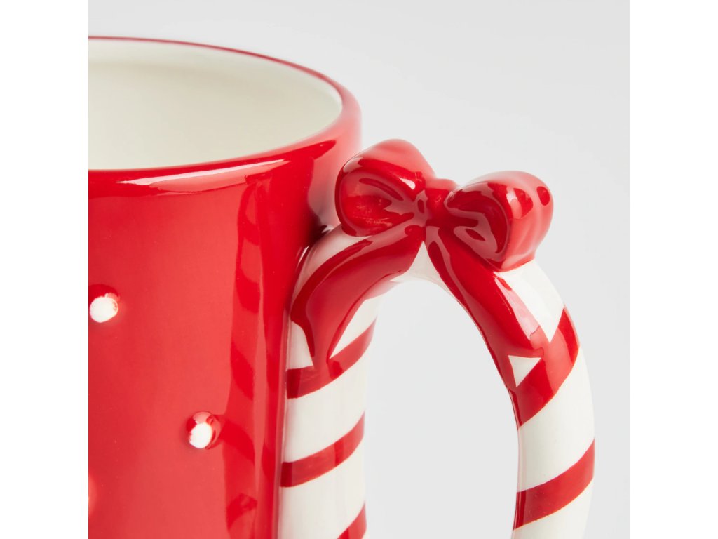 Ucho hrnčeka je navrhnuté v tvare ikonickej červeno-bielej cukríkovej palice a je zakončené lesklou červenou mašľou.