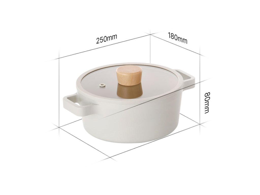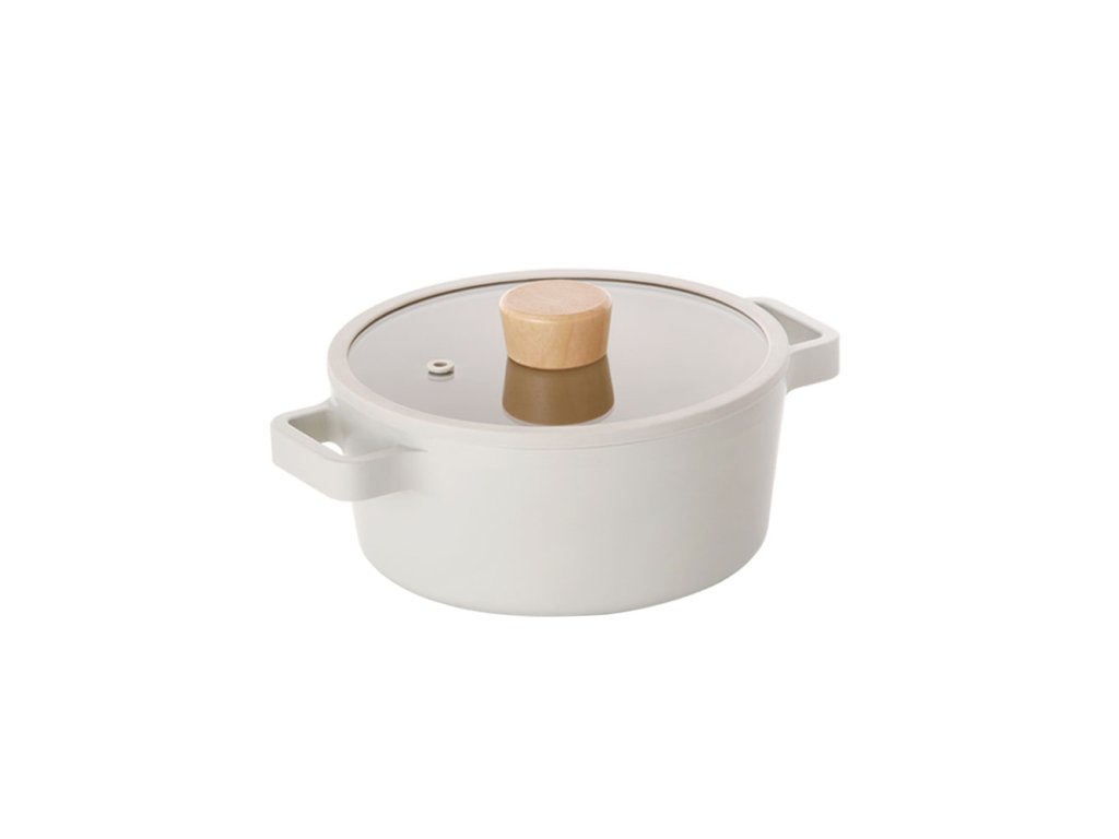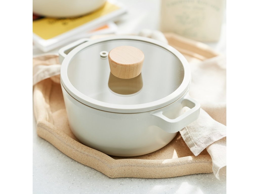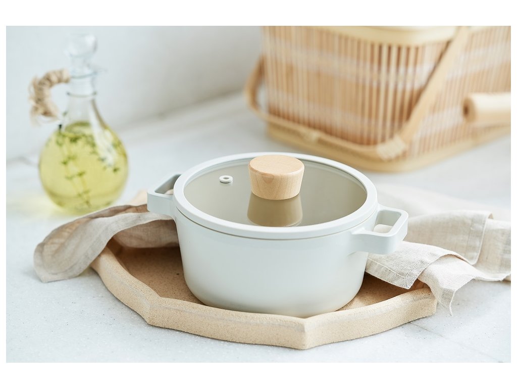 Inšpirovaný škandinávskym štýlom, má hrniec jednoduché oblé tvary, matný, špinavobiely exteriér a lesklý vnútrajšok v pieskovej farbe. Drevané rukoväte dodávajú eleganciu. Sklenená pokrievka so silikónovým okrajom zaisťuje presné a tiché zatváranie.