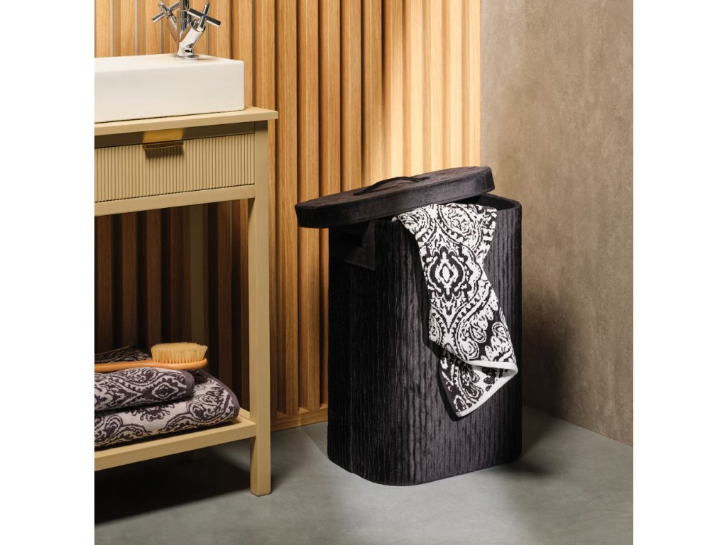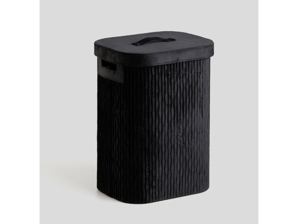 Elegantný, velúrový kôš na bielizeň v hlbokej čiernej farbe. Jeho luxusný materiál a jednoduchý, no zároveň štýlový dizajn spôsobujú, že sa dokonale hodí do moderných interiérov, spájajúc funkčnosť s dekoračným prvkom. Je ideálny na uskladnenie bielizne v každej kúpeľni.