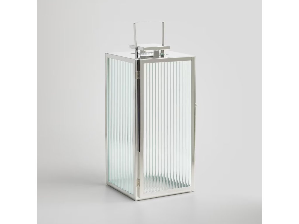 Štýlový lampáš vyrobený z kovu v striebornej farbe, s dvierkami z ryhovaného (rebrovaného) skla. Jeho elegantný dizajn a decentná povrchová úprava vnesú do každého interiéru hrejivú, útulnú atmosféru. Ideálny na dekoráciu stolov, parapetov alebo ako romantický zdroj svetla.