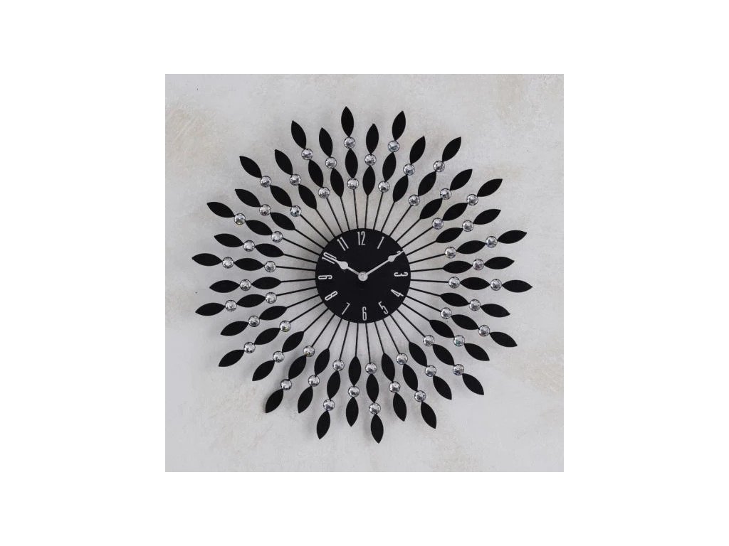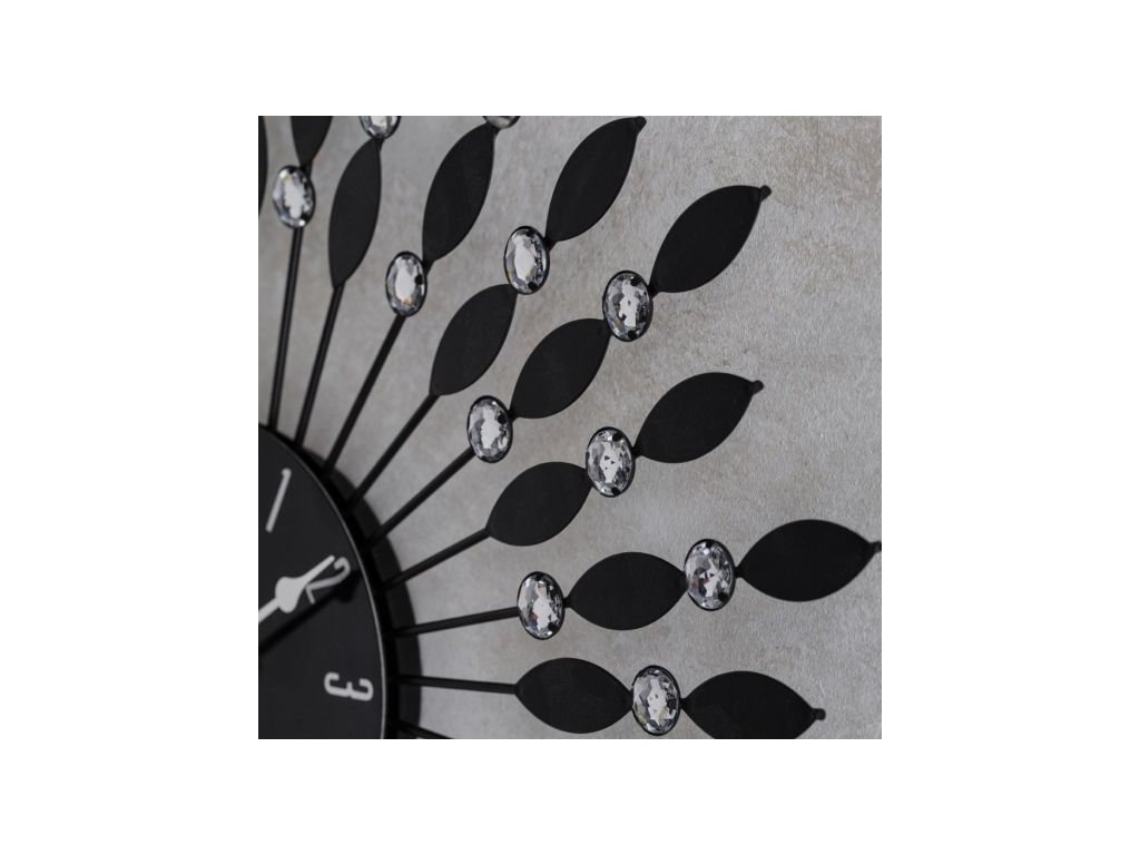 Extravagantné nástenné hodiny, ktoré sa stanú dominantným prvkom každého moderného a štýlového interiéru. Ich dizajn pripomína rozkvitnutú kvetinu alebo slnečné lúče, s matným čiernym stredom ciferníka a lesklými čiernymi kovovými lúčmi. Každý lúč je ozdobený trblietavými čírymi kryštálmi, ktoré zachytávajú svetlo a vytvárajú fascinujúce odlesky.