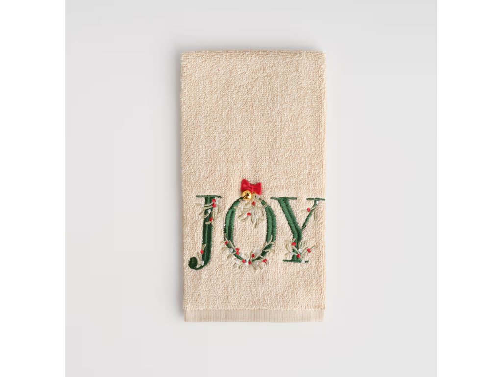 Subtílny béžový odtieň a dekoratívny sviatočný motív s vyšívaným nápisom „joy“ (radosť), zelenými vetvičkami, červenými bobuľami a zlatými zvončekmi dodávajú utierke výnimočný, teplý charakter. Starostlivo vyhotovené obšitie a estetické detaily spôsobujú, že sa tento model dokonale hodí tak do klasických, ako aj moderných aranžmánov kuchyne. Osvedčí sa aj ako drobný darček pre blízku osobu, ktorá si cení štýlové domáce doplnky.