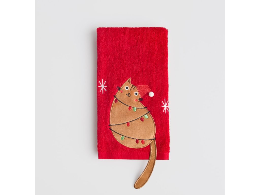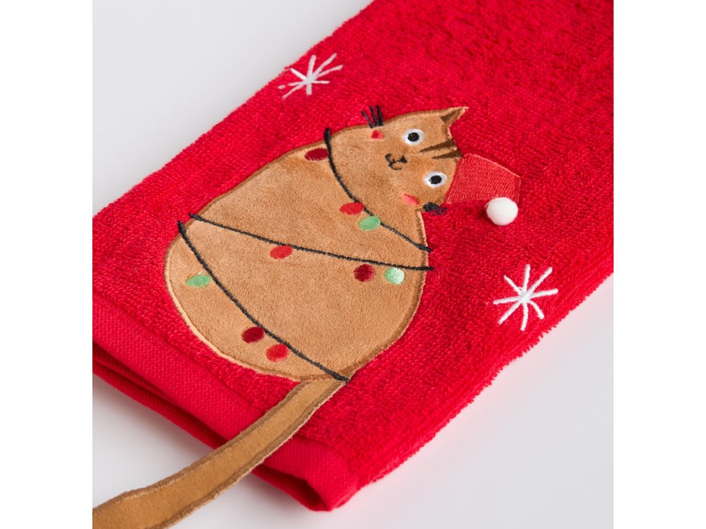 Intenzívne červená utierka je ozdobená pôvabnou aplikáciou mačky omotanej farebnými svetielkami a subtílnymi, vyšívanými snehovými vločkami. Sviatočný motív vnesie do kuchyne výnimočnú atmosféru a podčiarkne štýlový interiér – skvele sa prezentuje v klasických, ako aj moderných aranžmánoch. Je to tiež vynikajúci darček pre milovníkov neobyčajných doplnkov.