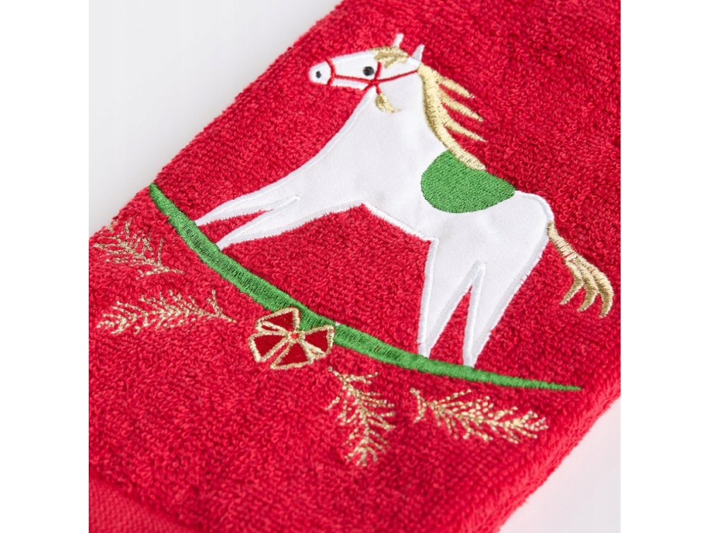 Je vyrobený výhradne z prírodnej bavlny, vďaka čomu je uterák mäkký, savý a príjemný na dotyk. Dokonale sa osvedčuje pri každodennom používaní a zároveň dodáva interiéru útulný, sviatočný charakter. Pevné spracovanie a vysoká kvalita tkaniny zaisťujú, že si zachová farbu a tvar aj po mnohých praniach.