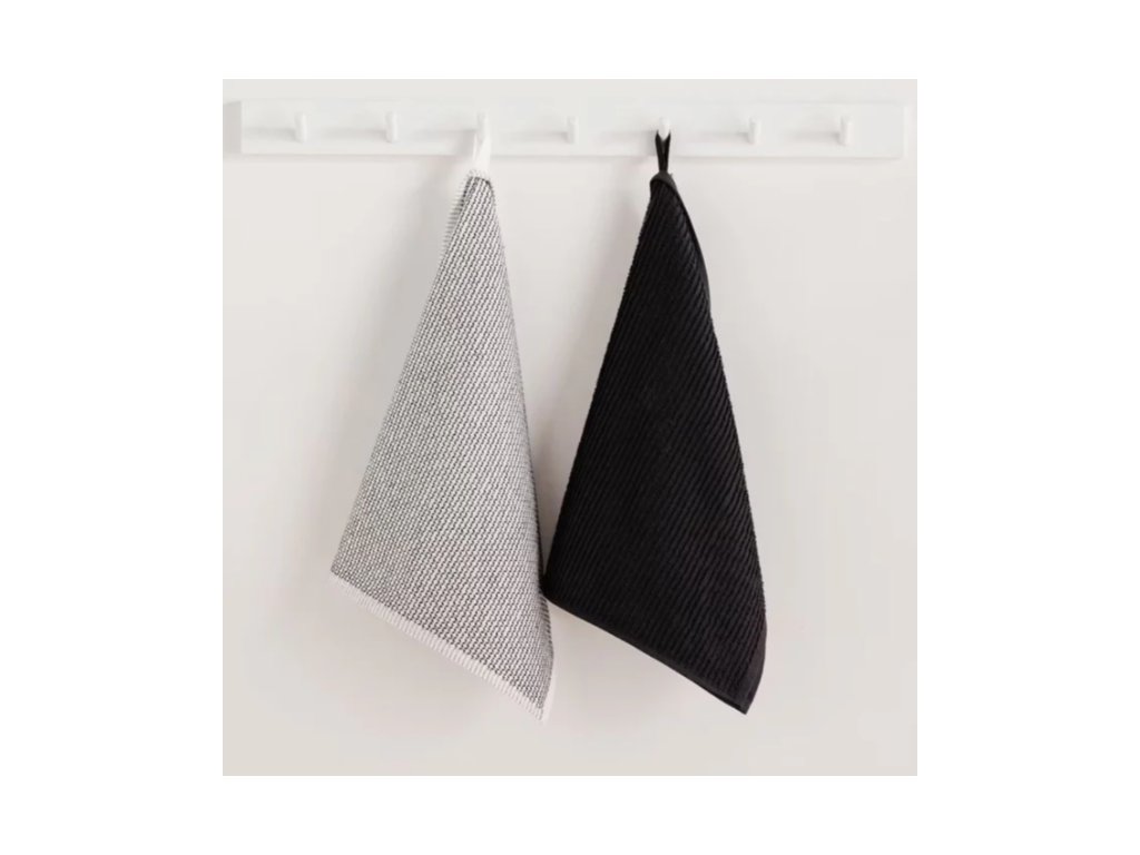 Dvojica štýlových kuchynských utierok. Jedna utierka je svetlosivá s jemnou štruktúrou, druhá čierna s výrazným rebrovaným vzorom. Tieto utierky sú nielen praktické pre každodenné použitie v kuchyni, ale aj elegantným doplnkom interiéru.