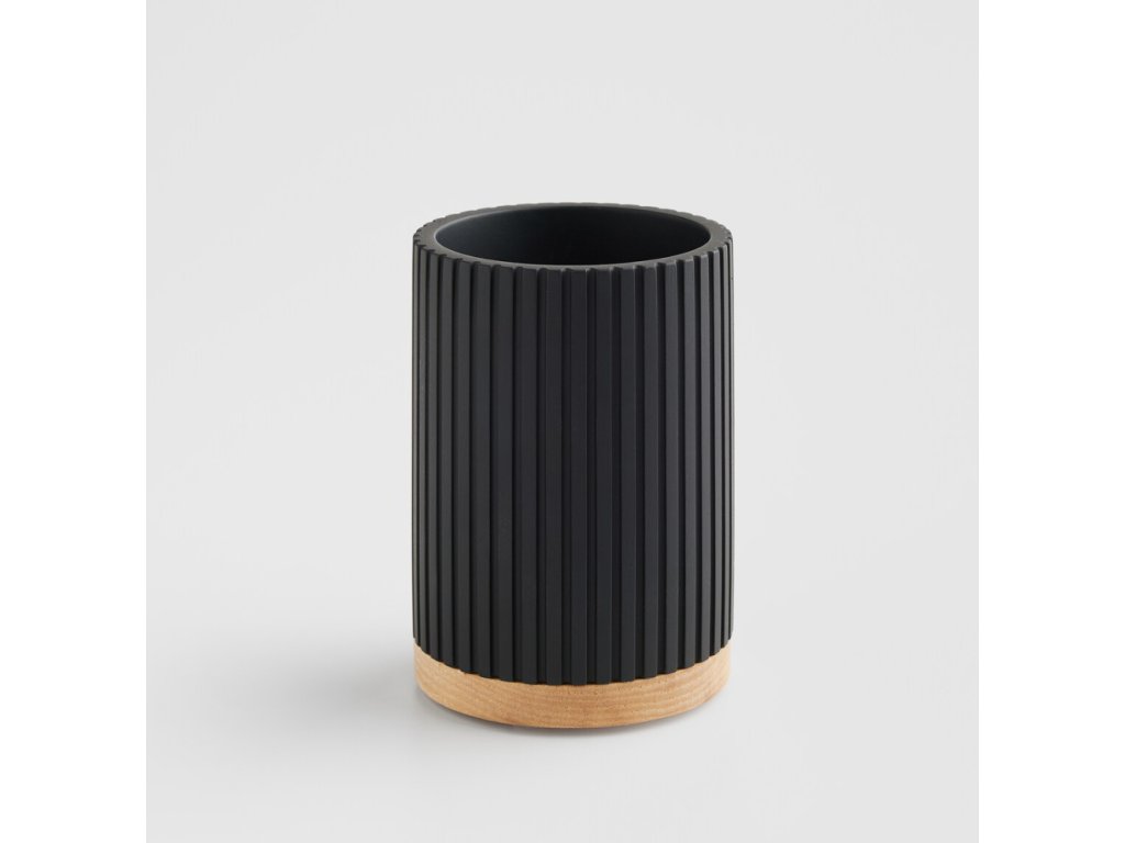 Čierna farba a vertikálne drážky (ryhovanie) prepožičiavajú poháru Ciri moderný a minimalistický charakter. Kontrastujúci drevený podstavec otepľuje dizajn, vnášajúc do kúpeľne nádych prirodzenosti. Pohár sa ideálne hodí do moderných, minimalistických, a tiež škandinávskych interiérov. Je to tiež vynikajúci nápad na darček pre milovníkov elegantných doplnkov do domácnosti.