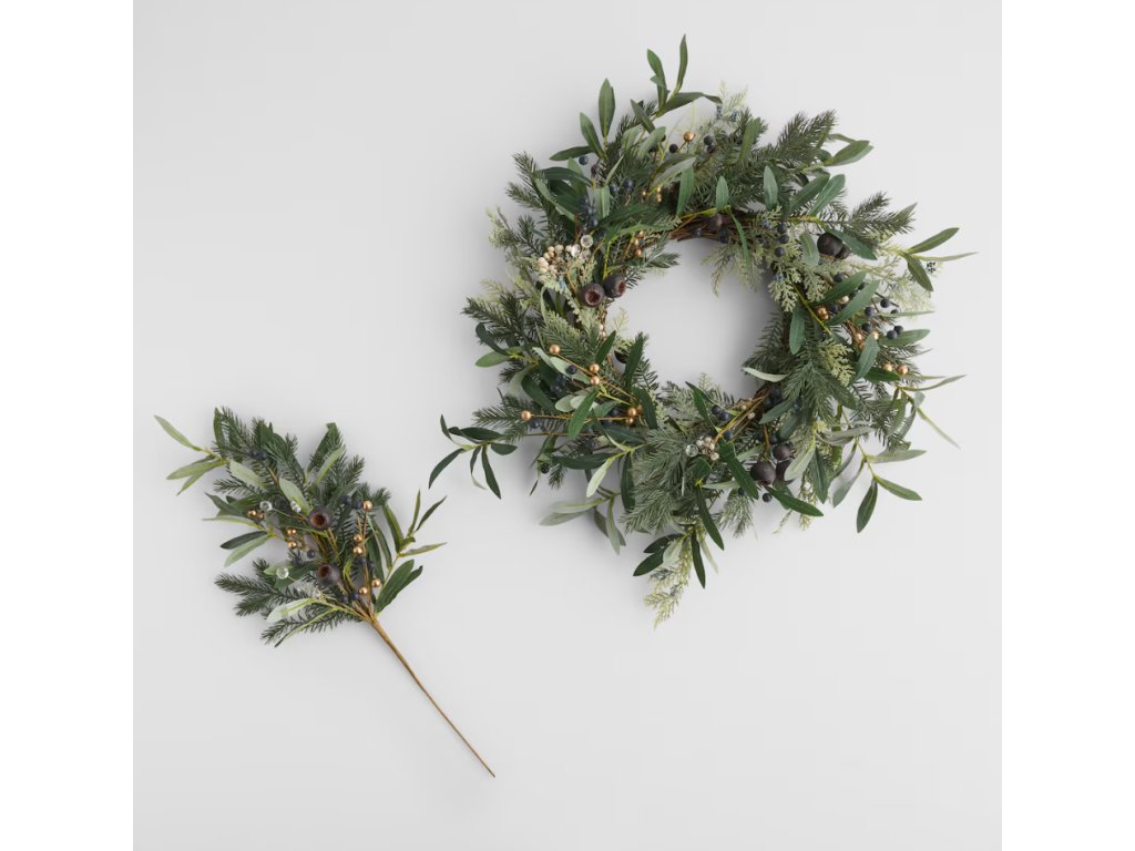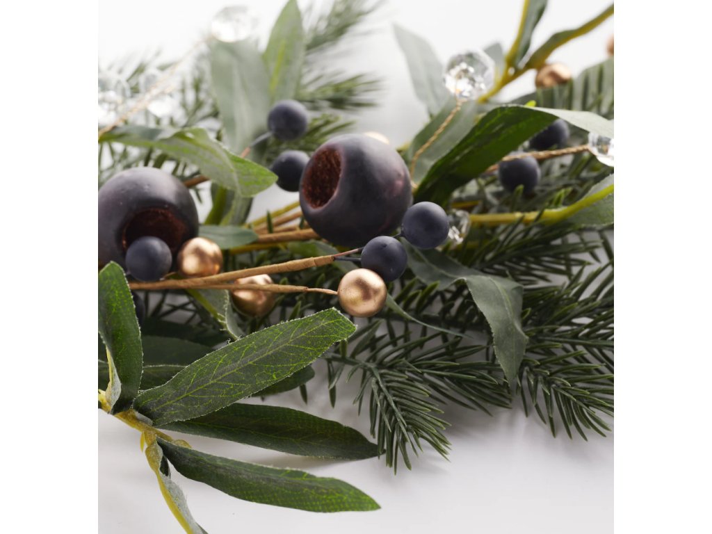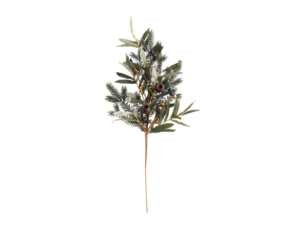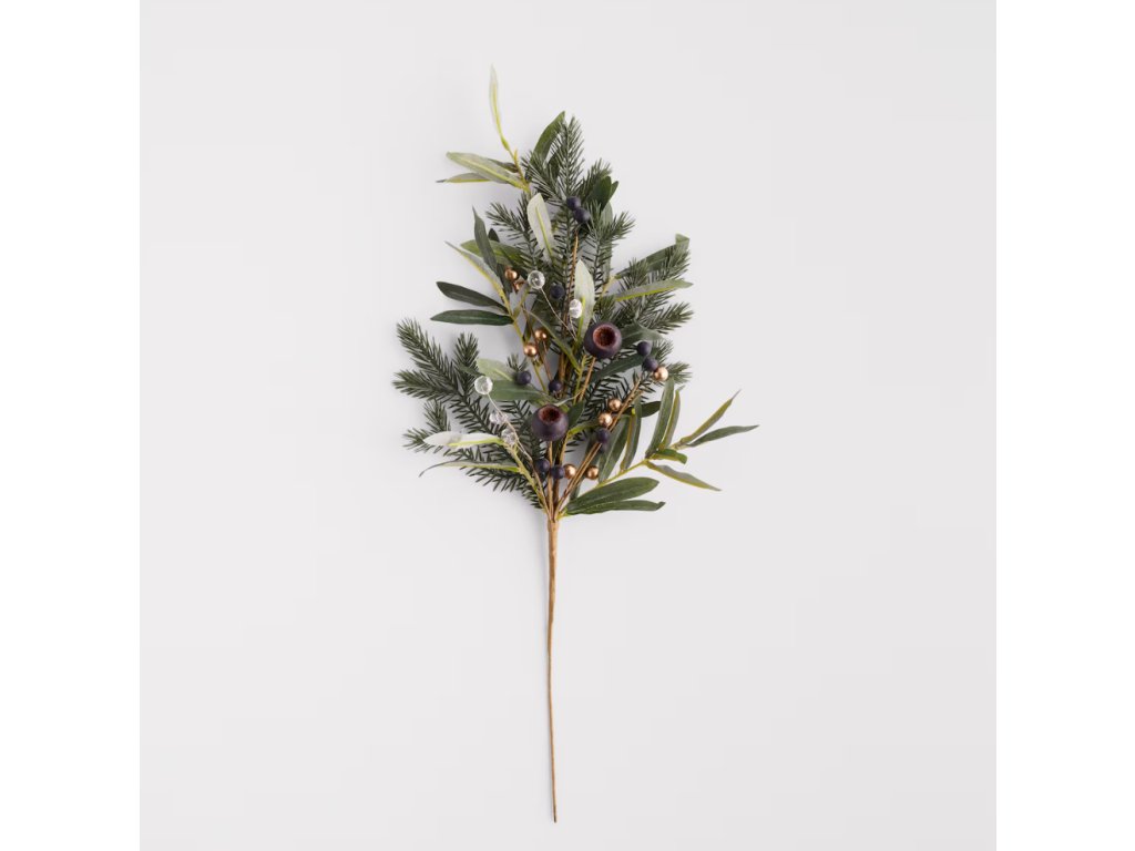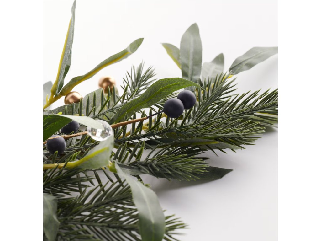 Vetvička je kombináciou tradičného zeleného ihličia a jemných, predĺžených olivových lístkov. Je bohato zdobená v štýle glamour rôznymi bobuľami a guľôčkami: