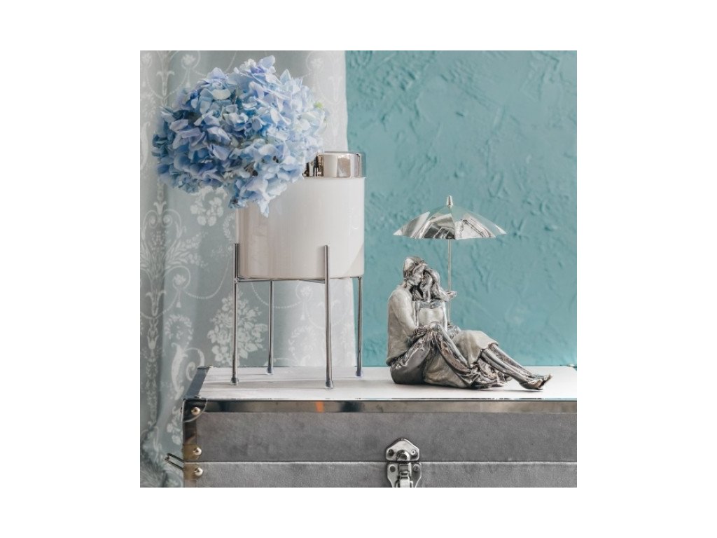 Moderný kvetináč s elegantným bielym telom a lesklým strieborným okrajom, ktorý je umiestnený na štíhlom kovovom stojane s chrómovou úpravou. Jeho minimalistický dizajn s čistými líniami a lesklými detailmi ho robí ideálnym doplnkom do súčasných interiérov, pridávajúc sofistikovaný dotyk k akejkoľvek rastline.