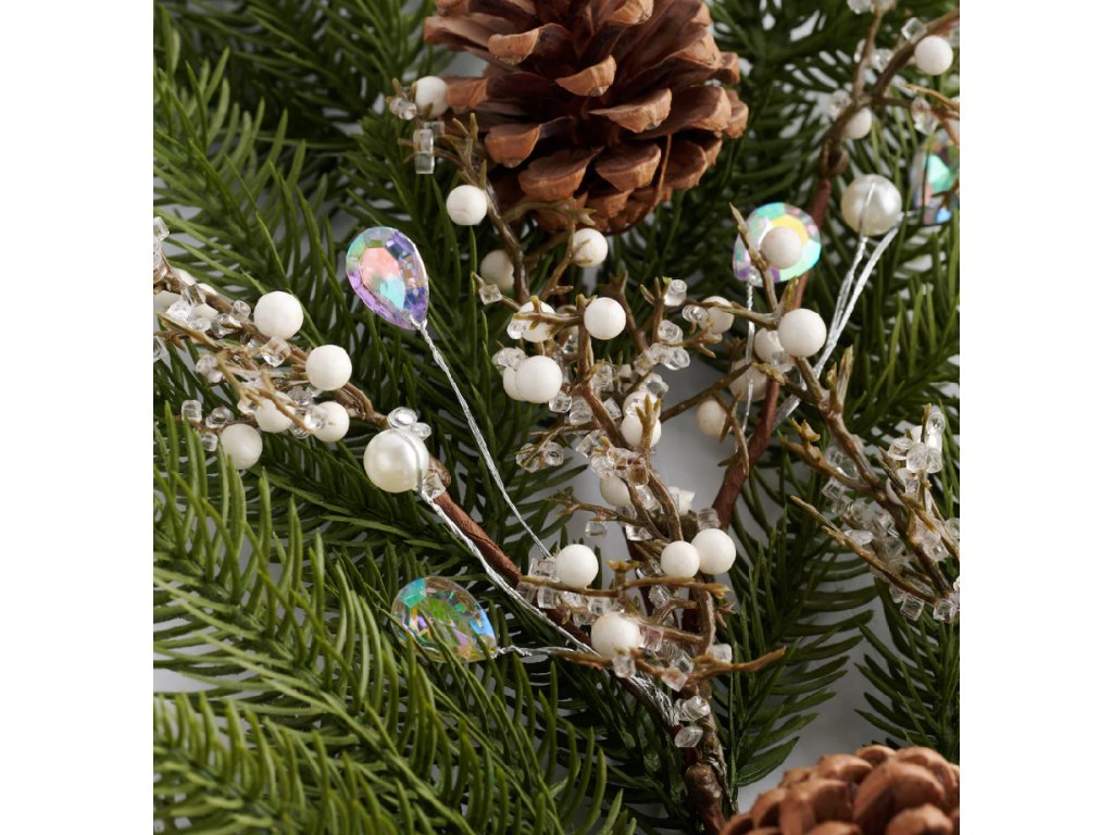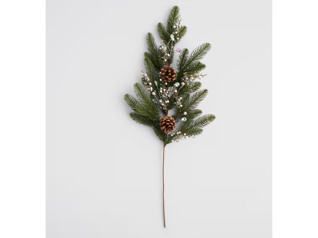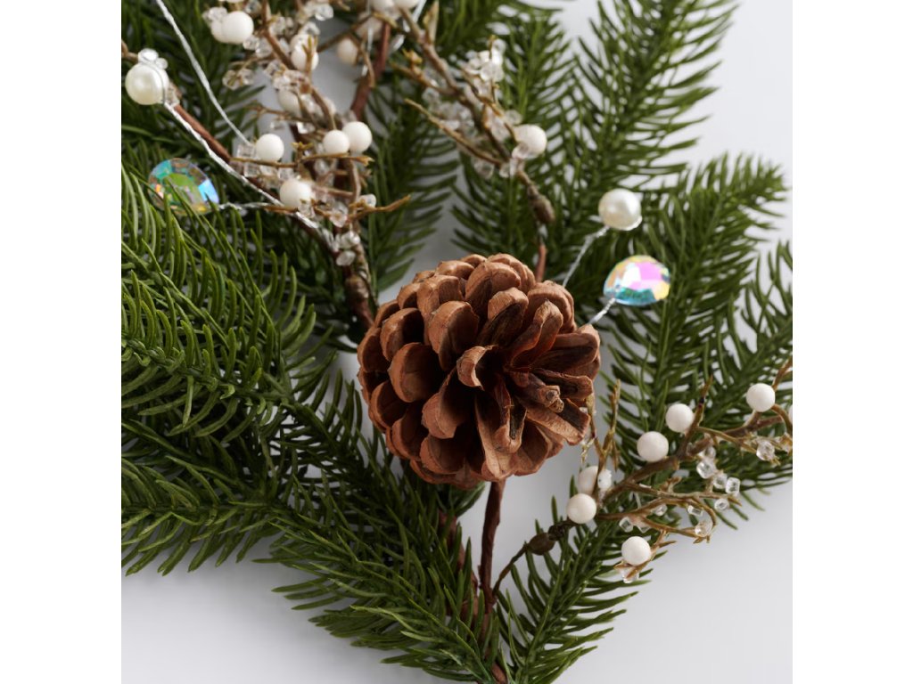 Vetvička je zložená z realisticky vyzerajúcich tmavozelených ihličiek a je bohato zdobená dvoma prírodnými šiškami a drobnými perličkami s irizujúcim leskom, ktoré imitujú sneh a ľad. Vďaka tomuto zdobenému glamour štýlu je táto kytica ideálna na vytvorenie vlastných vianočných vencov, kvetinových aranžmánov alebo na vyplnenie váz. Kombinácia prírodných elementov a trblietavých detailov vytvára v interiéri hrejivú a zároveň sviatočnú atmosféru.