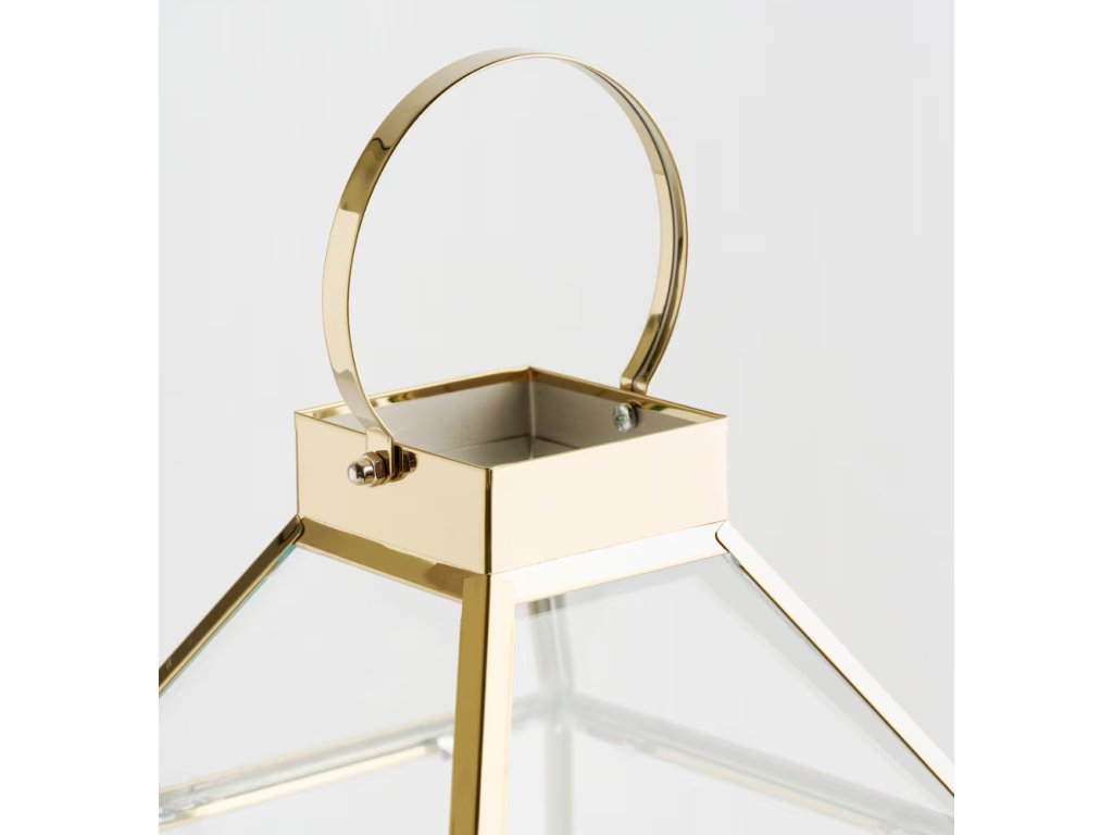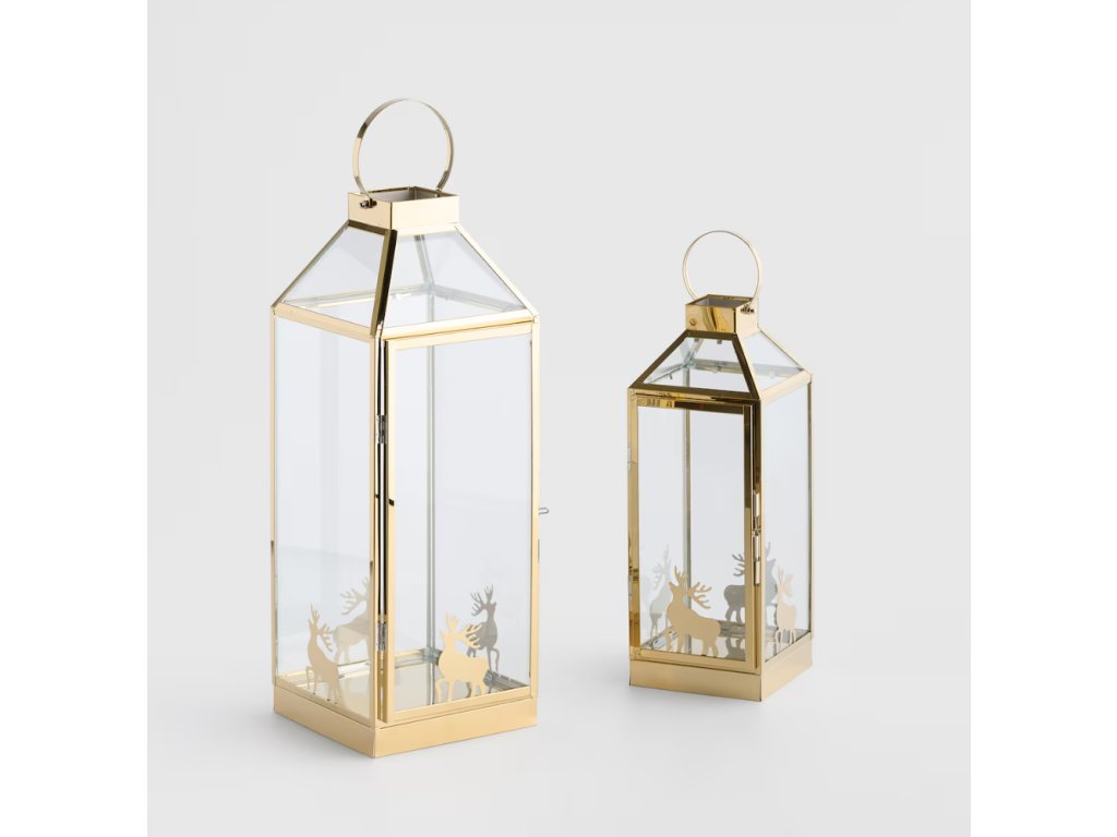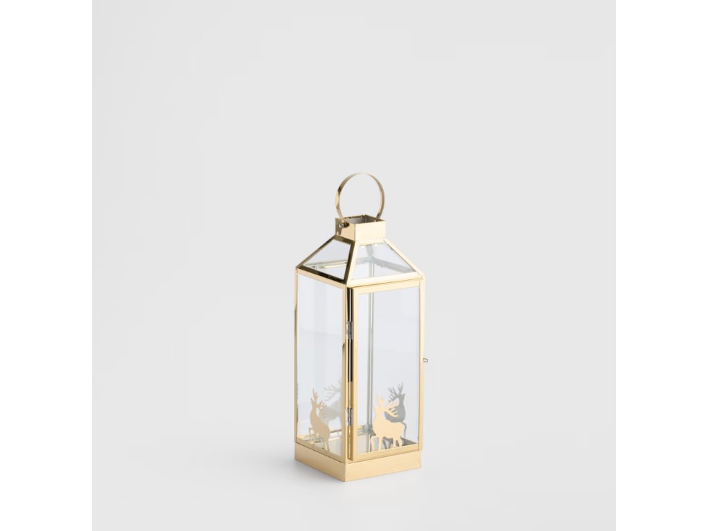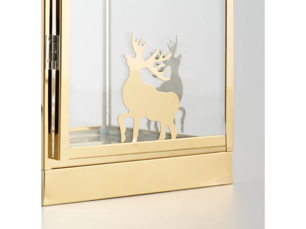 Luxusný zlatý lampáš prinesie do každého interiéru sviatočnú eleganciu. Jeho konštrukcia kombinuje pozlátený kov a sklenené steny, ktoré sú zdobené vyrezávaným motívom sobov. Tento svietnik s výškou 35 cm je ideálny na umiestnenie sviečky, ktorá prežiari motív soba a vytvorí teplú, tradičnú atmosféru. Je to efektná dekorácia na stôl, komodu alebo krbovú rímsu.