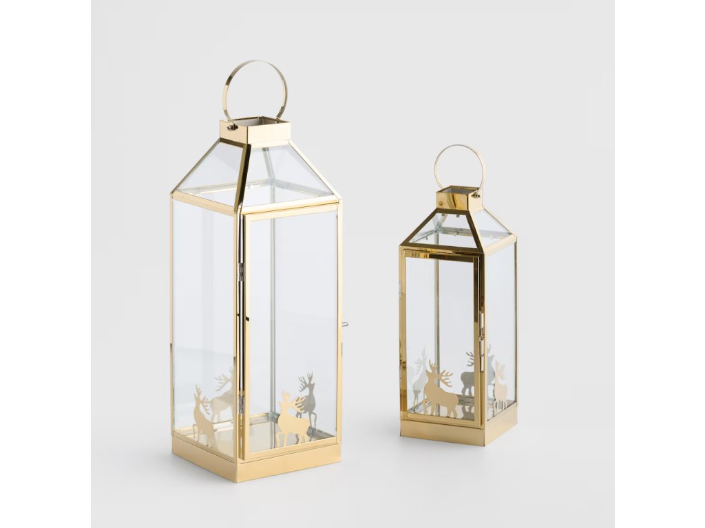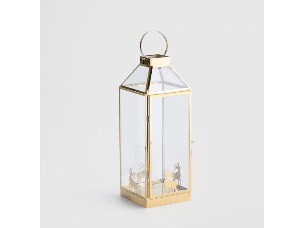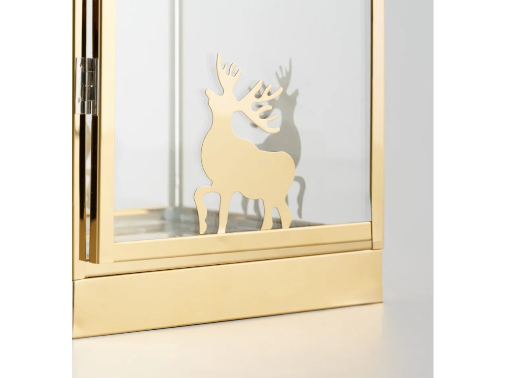 Vytvorte si vo svojom domove čarovnú atmosféru s elegantným lampášom Dearni. Tento vysoký, pozlátený kovový lampáš v tradičnom štýle je doplnený sklenenými stenami, ktoré chránia svetlo sviečky a zároveň ho rozptyľujú. Zlaté siluety sobov na spodnej časti lampáša vnášajú sviatočný motív. S výškou 47 cm a štíhlym tvarom je ideálny ako dominantná dekorácia na podlahu, komodu alebo veľký stôl, čím dodá vášmu interiéru teplý a tradičný vianočný nádych.