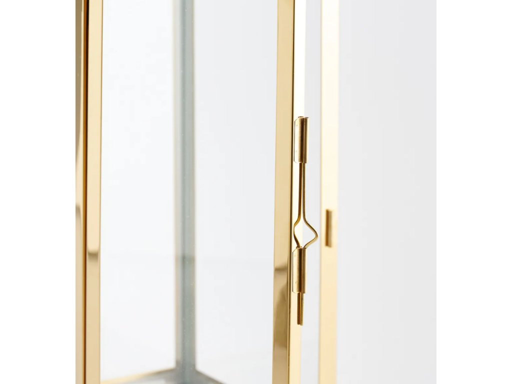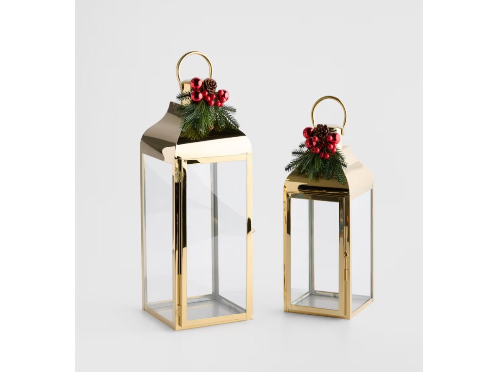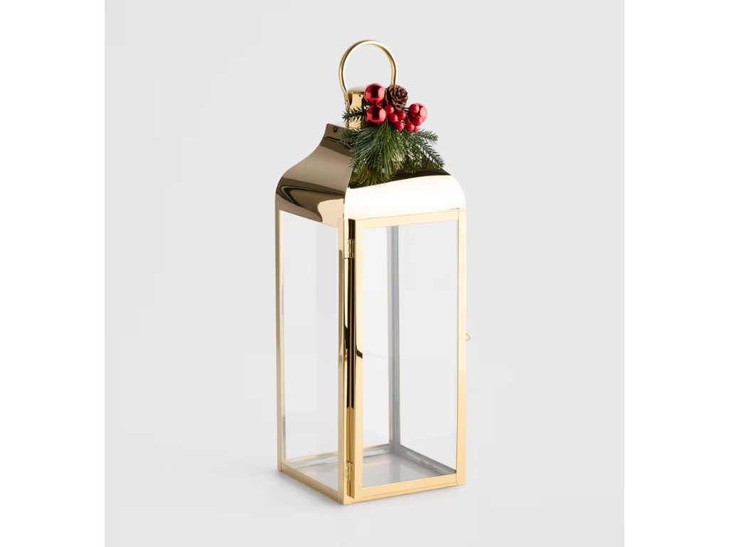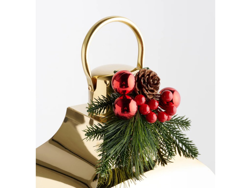 Lampáš Shinet – Zlatá Elegancia Vysoký zlatý lampáš Shinet vyrobený z pozláteného kovu a skla je esenciou sviatočnej elegancie. Jeho telo je určené pre sviečku (alebo LED svetlo), zatiaľ čo vrch lampáša je už tradične zdobený zelenými vetvičkami, lesklými červenými bobuľami a šiškami. Lampáš je ideálny na umiestnenie na podlahu, komodu alebo terasu, kde vytvorí hrejivé svetlo.