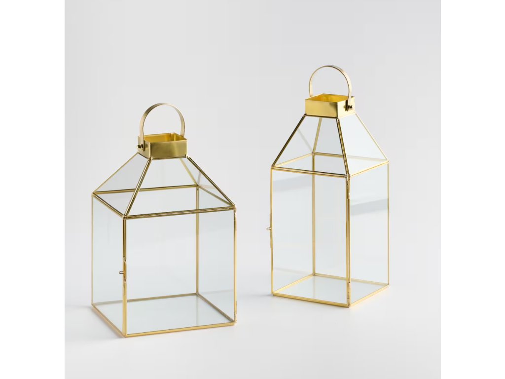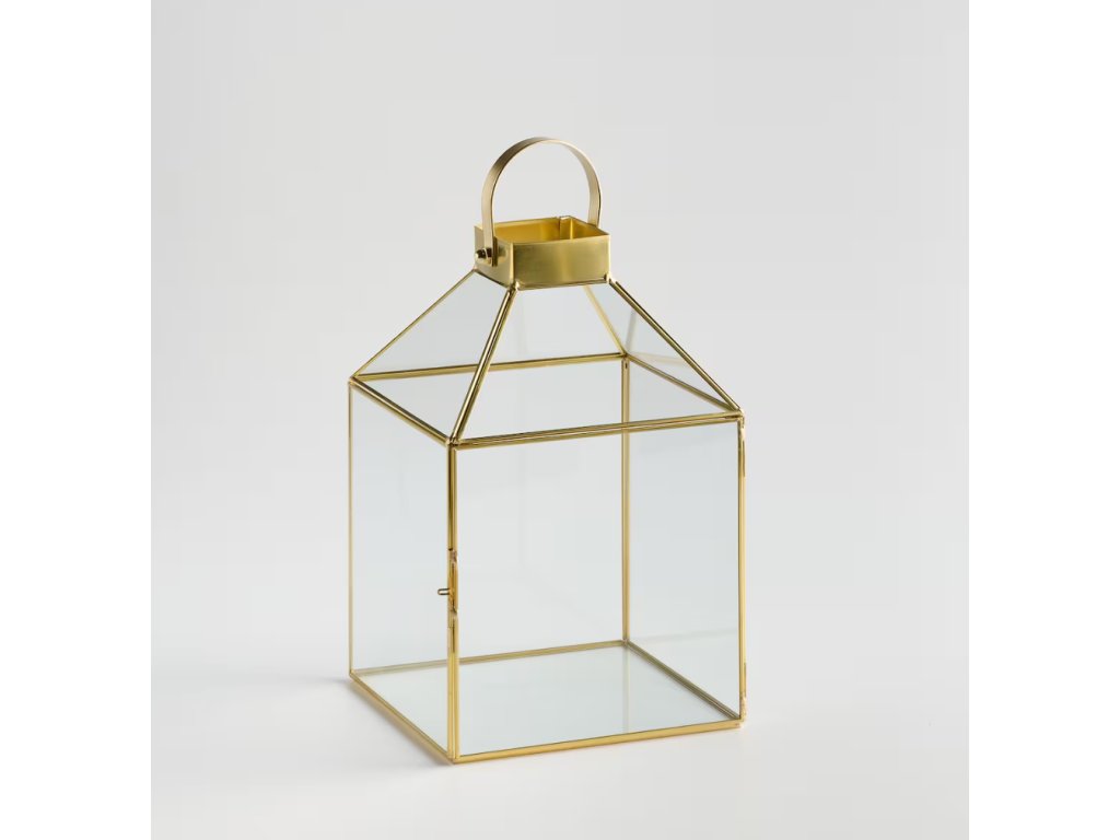 Lampáš zo skla s prídavkom kovu v zlatej farbe, s rozmermi 29 cm x 19 cm x 19 cm, je elegantná dekorácia, ktorá vnáša nádych luxusu a tepla do každého interiéru. Jeho transparentné sklo krásne odráža svetlo, vytvárajúc útulnú atmosféru, a zlaté kovové akcenty mu dodávajú rafinovaný lesk. Ideálny na umiestnenie na stôl, komodu či na parapetnú dosku. Vynikajúco sa prezentuje s rôznymi druhmi sviečok, vytvárajúc efektné svetelné odlesky a dodávajúc eleganciu každej miestnosti. Jeho štýlový dizajn ho robí praktickým a zároveň dekoračným, čím predstavuje krásnu ozdobu v každom interiéri.