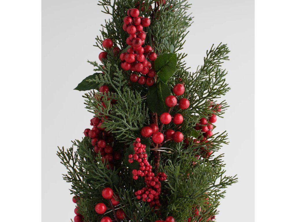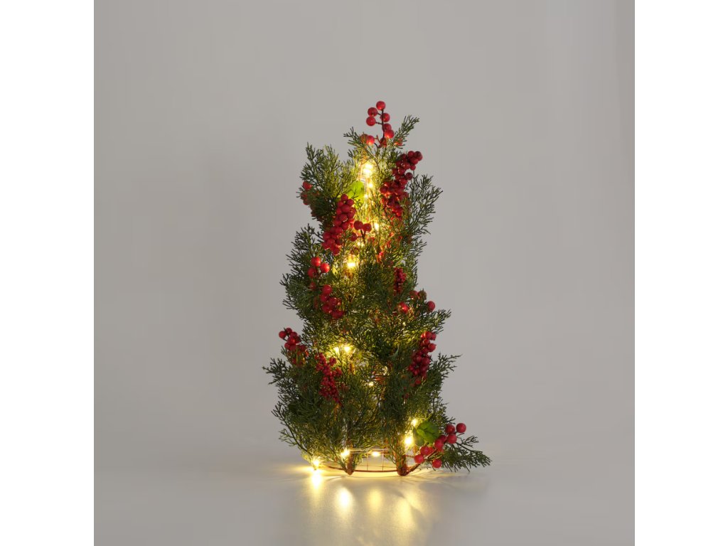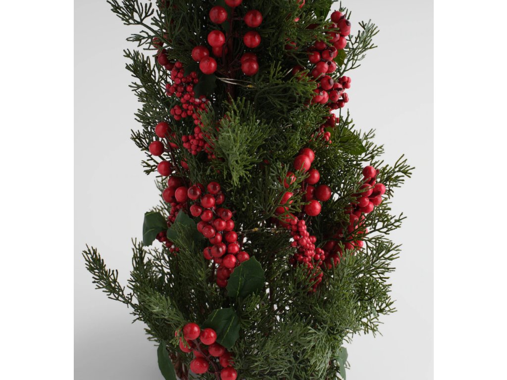 Malý stromček s veľkým šarmom! LED Dekorácia Celin (50 cm) je ideálny doplnok do Vašej sviatočnej výzdoby. Kombinácia tmavého ihličia, žiarivých červených bobúľ a teplého LED osvetlenia vytvára útulnú a prirodzenú vianočnú atmosféru. Vďaka batériovému napájaniu ho môžete postaviť kamkoľvek – na stôl, komodu alebo krb.