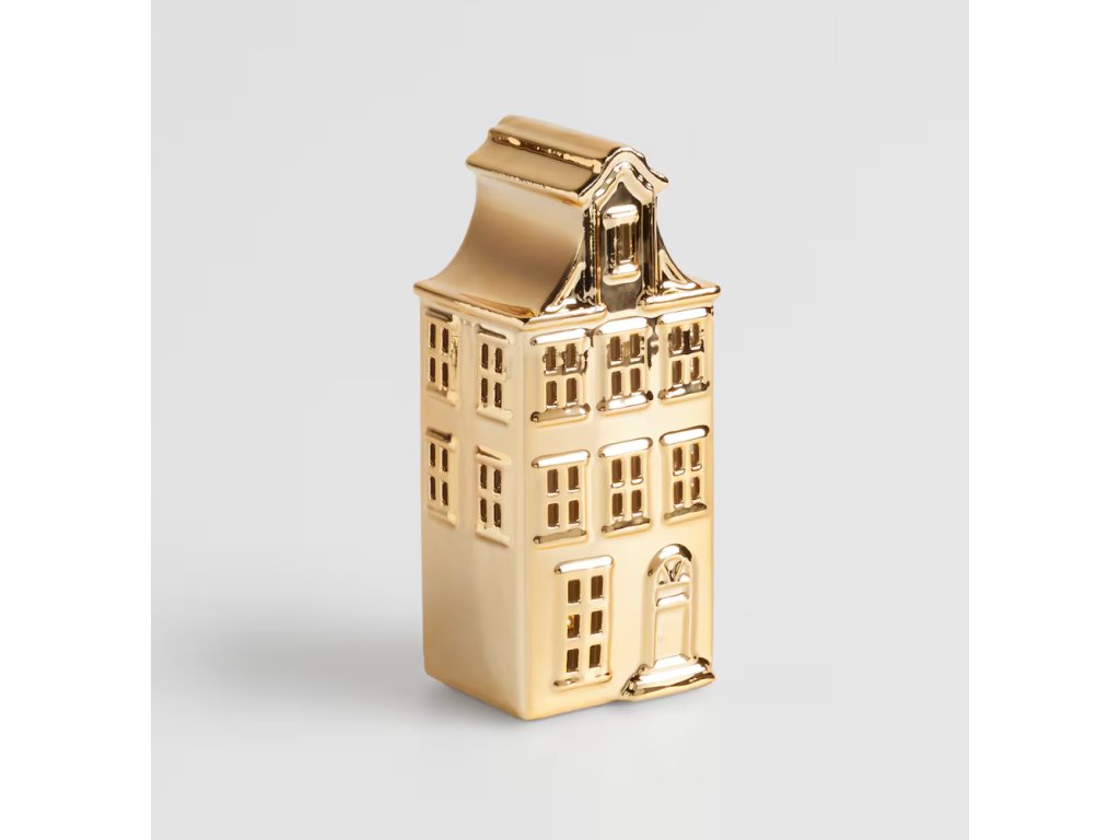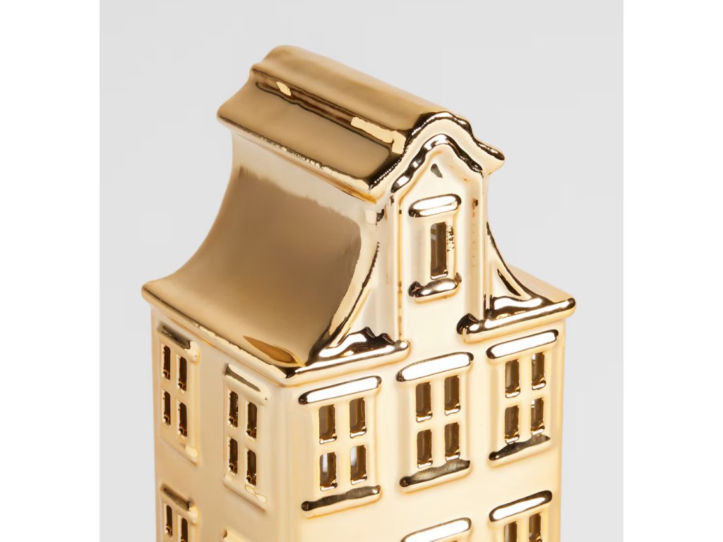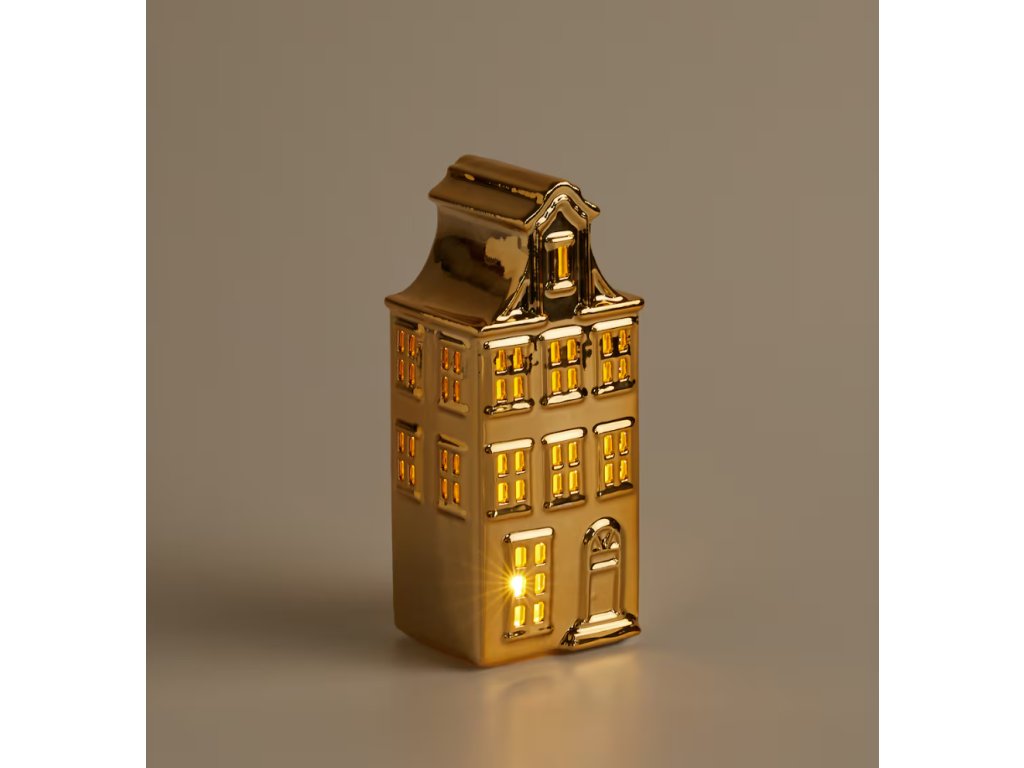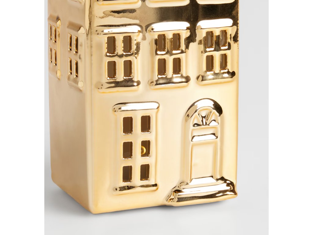 Vneste do svojho domova žiarivý akcent s LED figúrkou Tarak. Táto keramická dekorácia v tvare štýlového mestského domčeka je dokonalou kombináciou moderného lesku a nadčasovej architektúry. Luxusná zlatá povrchová úprava zaručene pritiahne pozornosť. Vstavané LED osvetlenie (batérie súčasťou) jemne presvitá cez okná a vytvára útulnú a slávnostnú atmosféru. S výškou 20 cm sa stane dominantou na poličke, komode alebo sviatočnom stole.