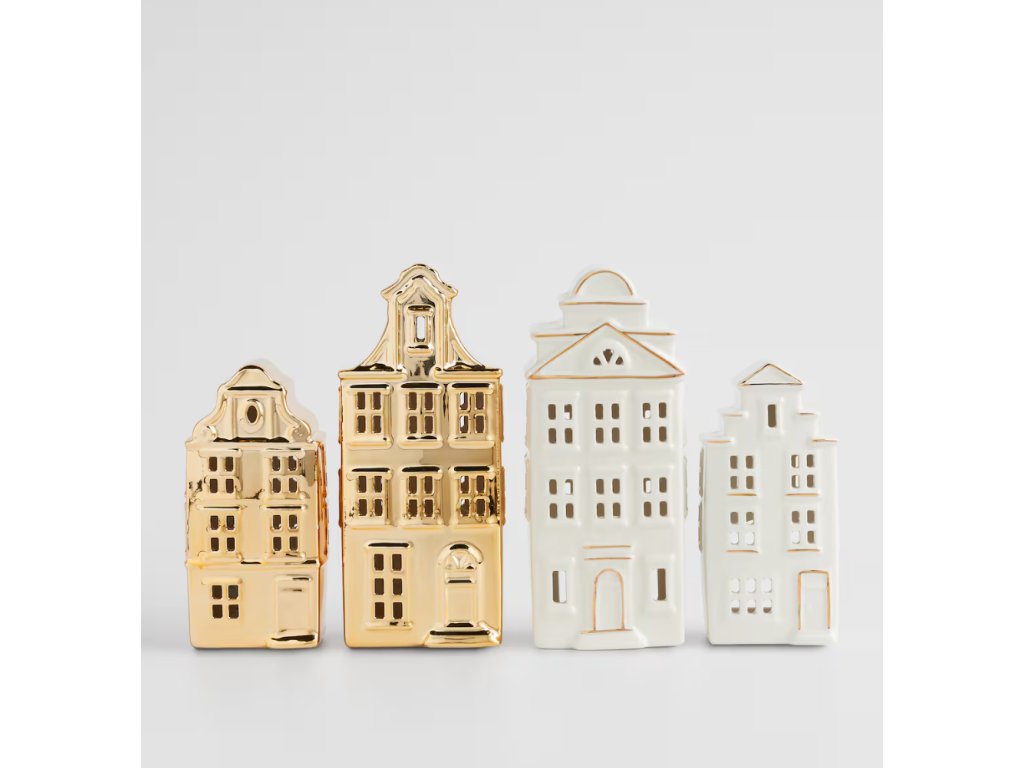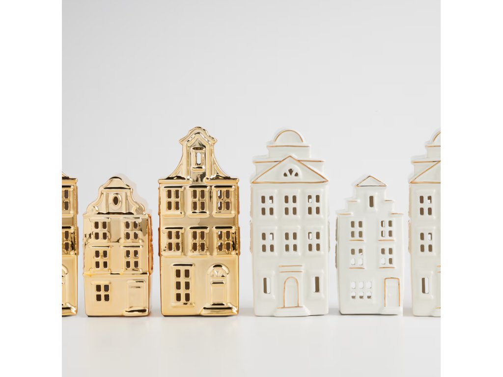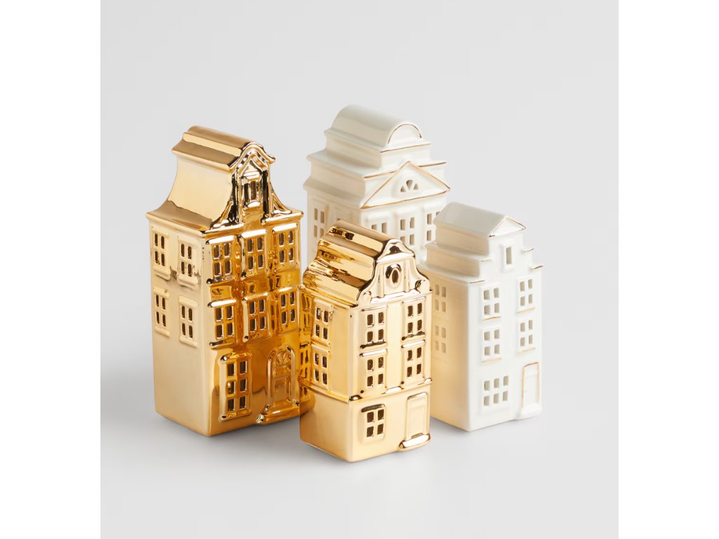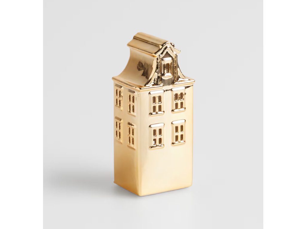 Vneste do svojho domova žiarivý akcent s LED figúrkou Tarak. Táto keramická dekorácia v tvare štýlového mestského domčeka je dokonalou kombináciou moderného lesku a nadčasovej architektúry. Luxusná zlatá povrchová úprava zaručene pritiahne pozornosť. Vstavané LED osvetlenie (batérie súčasťou) jemne presvitá cez okná a vytvára útulnú a slávnostnú atmosféru. S výškou 20 cm sa stane dominantou na poličke, komode alebo sviatočnom stole.