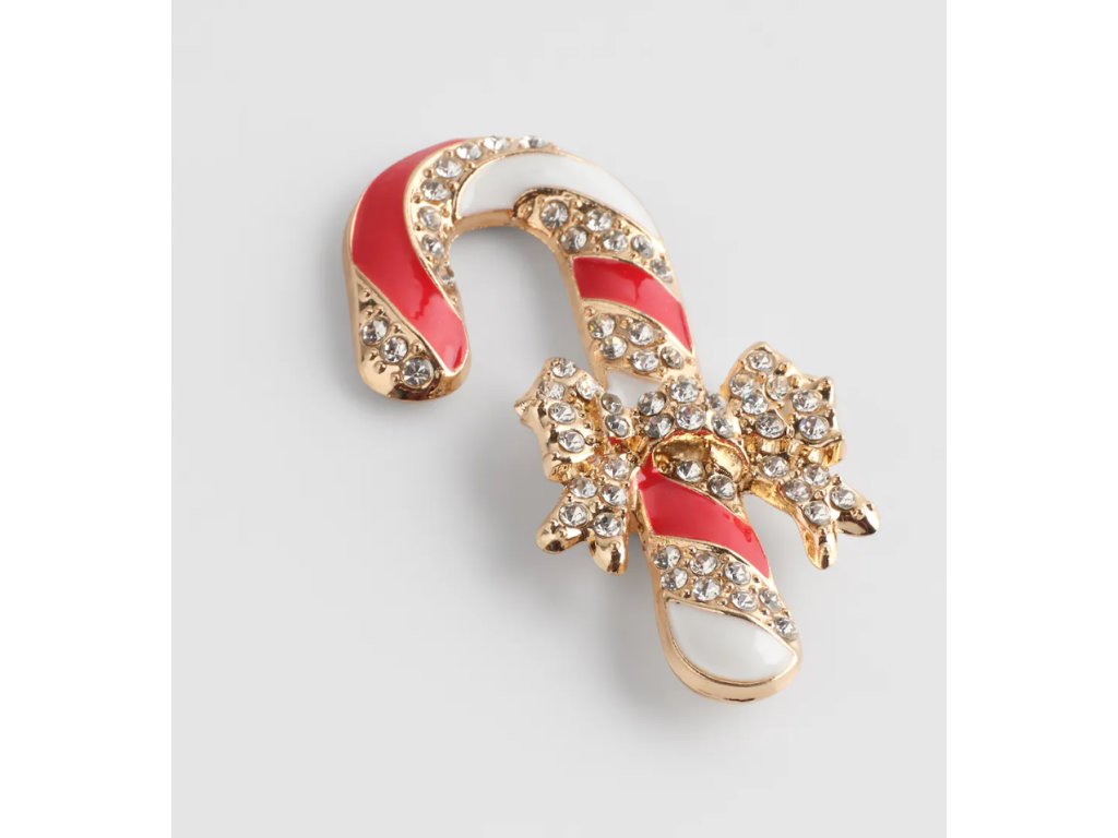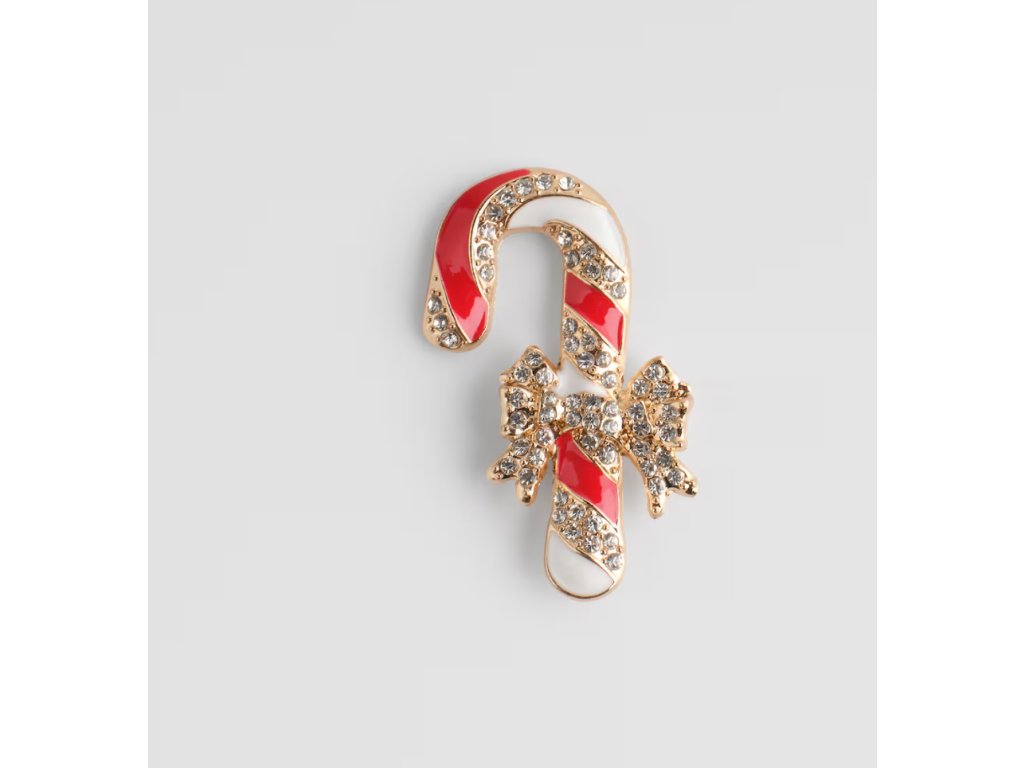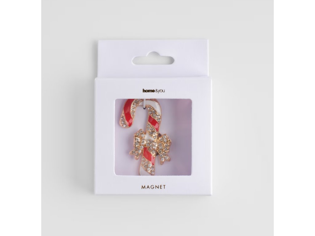 Táto magnetka je vyrobená zo zliatiny zinku s výrazným zlatým vyhotovením a jej povrch je pokrytý červeným a bielym emailom v tvare tradičného cukríka. Dekorácia je bohato osadená čírymi krištálikmi (sklo), ktoré vytvárajú trblietavý efekt v glamour štýle. Palica je navyše ozdobená veľkou mašľou, tiež vysadenou krištálikmi, čo podčiarkuje jej luxusný vzhľad. Vďaka trvácnemu materiálu si zachová lesk počas celej vianočnej sezóny.