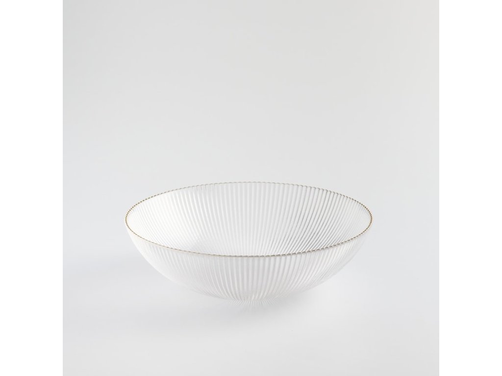 Misa zo sodno-vápenatého skla s výškou 7,5 cm a priemerom 25 cm, ozdobená zlatým okrajom, je elegantný a rafinovaný dekoračný prvok. Jej transparentné sklo dodáva ľahkosť a jemné zlaté prevedenie na okraji pridáva luxusný akcent. Misa sa dokonale hodí ako nádoba na ovocie, šaláty alebo ako samostatná ozdoba stola, vnášajúc do interiéru subtílny lesk a nadčasovú eleganciu. Ideálna je na každodenné použitie aj na špeciálne príležitosti.