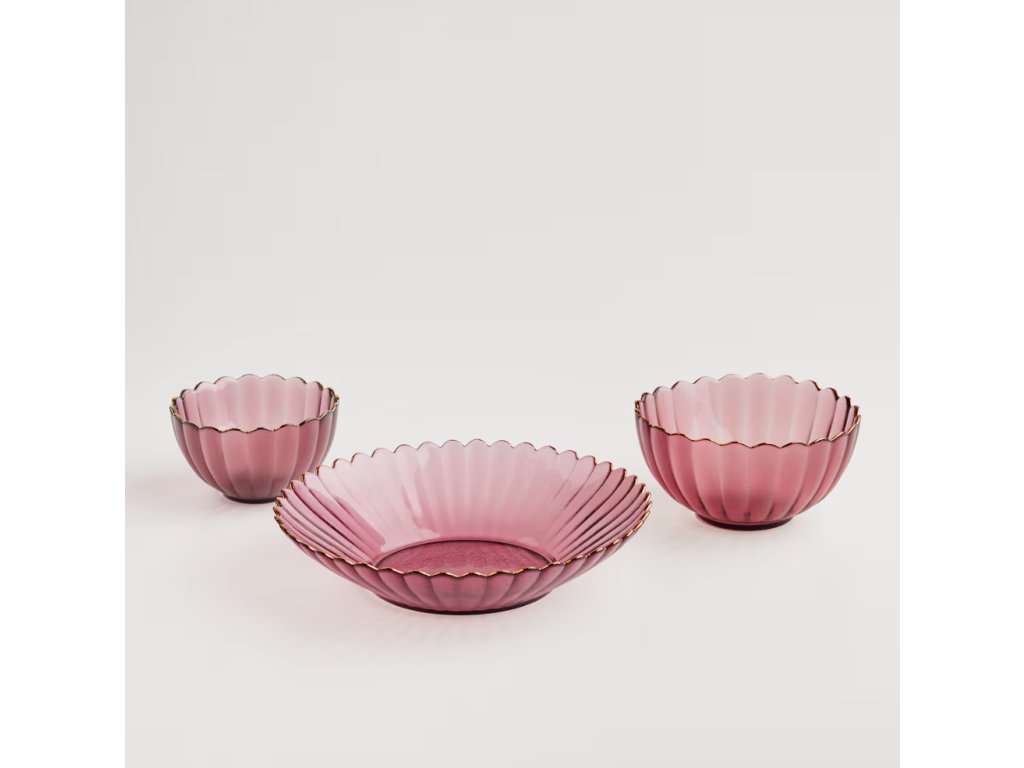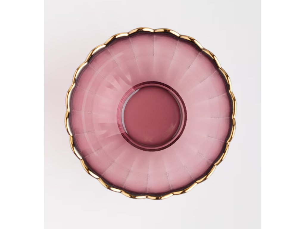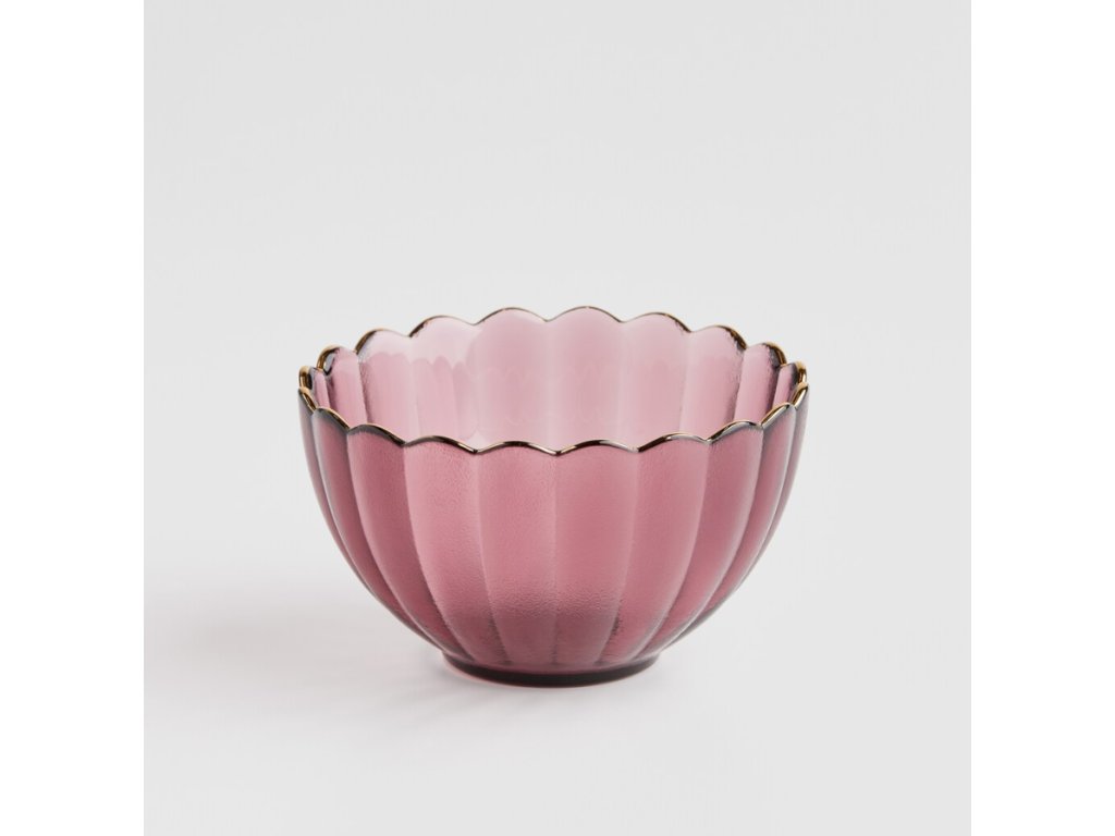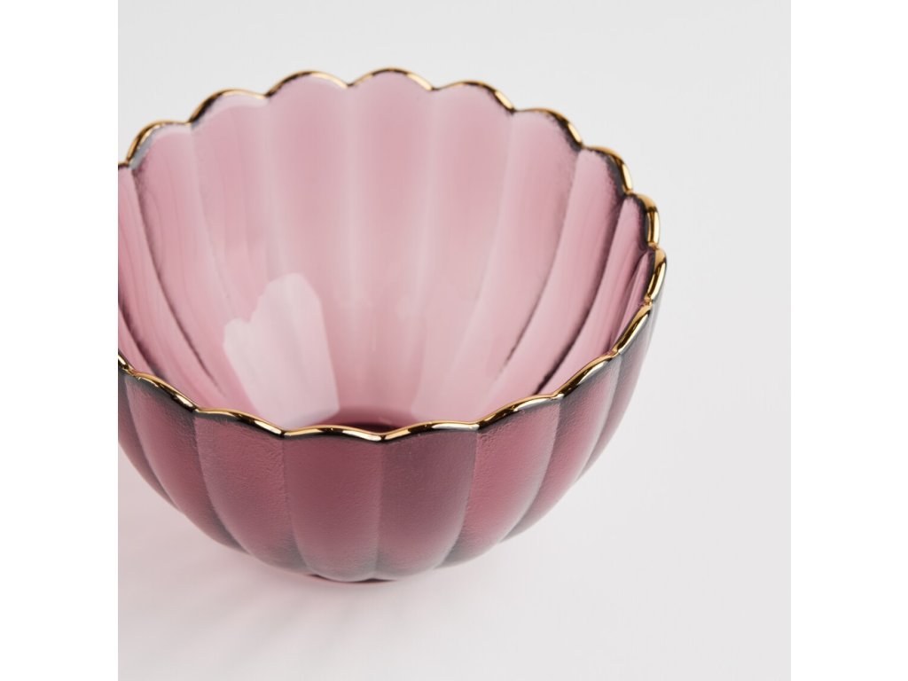 Elegantná miska je vyrobená z priehľadného skla v sýtej tmavoružovej farbe, ozdobená jemným zlatým okrajom. Je ideálna na servírovanie dezertov, pochutín alebo ako dekoračný prvok stola. Spojenie intenzívnej farby a decentného zlatého akcentu dodáva mištičke výnimočný charakter, vďaka čomu sa stane štýlovým doplnkom každého riadu.