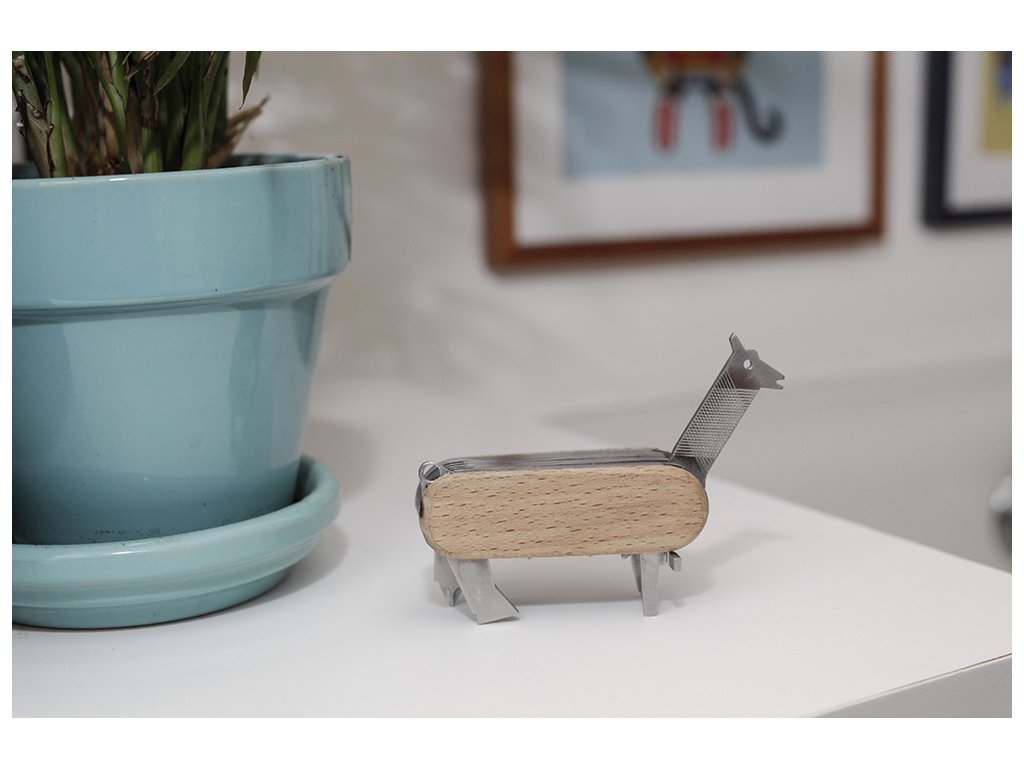 Tento multifunkčný nástroj v tvare alpaky je dokonalým spoločníkom pre všetkých, ktorí majú radi originálne a praktické riešenia. Vďaka svojmu kompaktnému dizajnu a drevenej rukoväti sa pohodlne drží v ruke, no zároveň v sebe ukrýva až sedem rôznych funkcií.