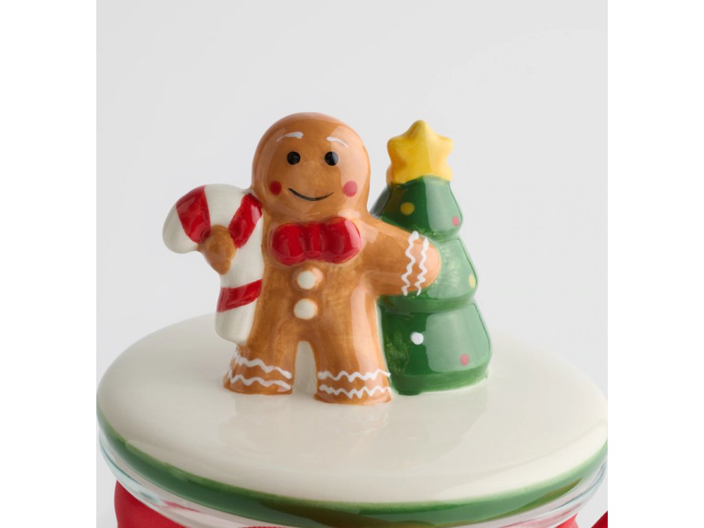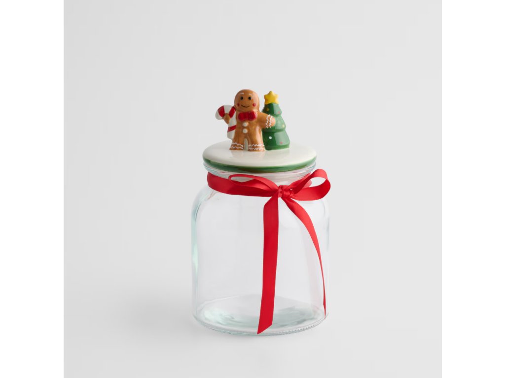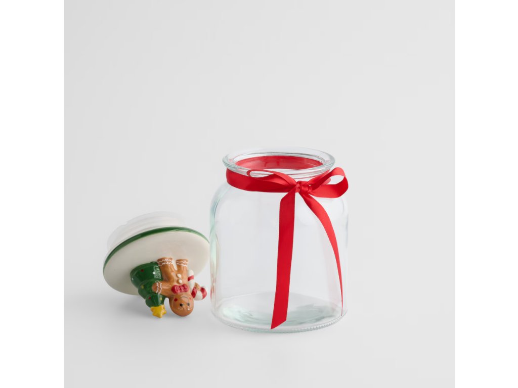 Perníkový panáčik a jeho vianočné tajomstvá! Táto roztomilá sklenená dóza s keramickým viečkom, ktoré zdobí perníkový panáčik a malý stromček, je ideálna na uskladnenie vianočných sušienok, cukríkov alebo darčekových maškrty.