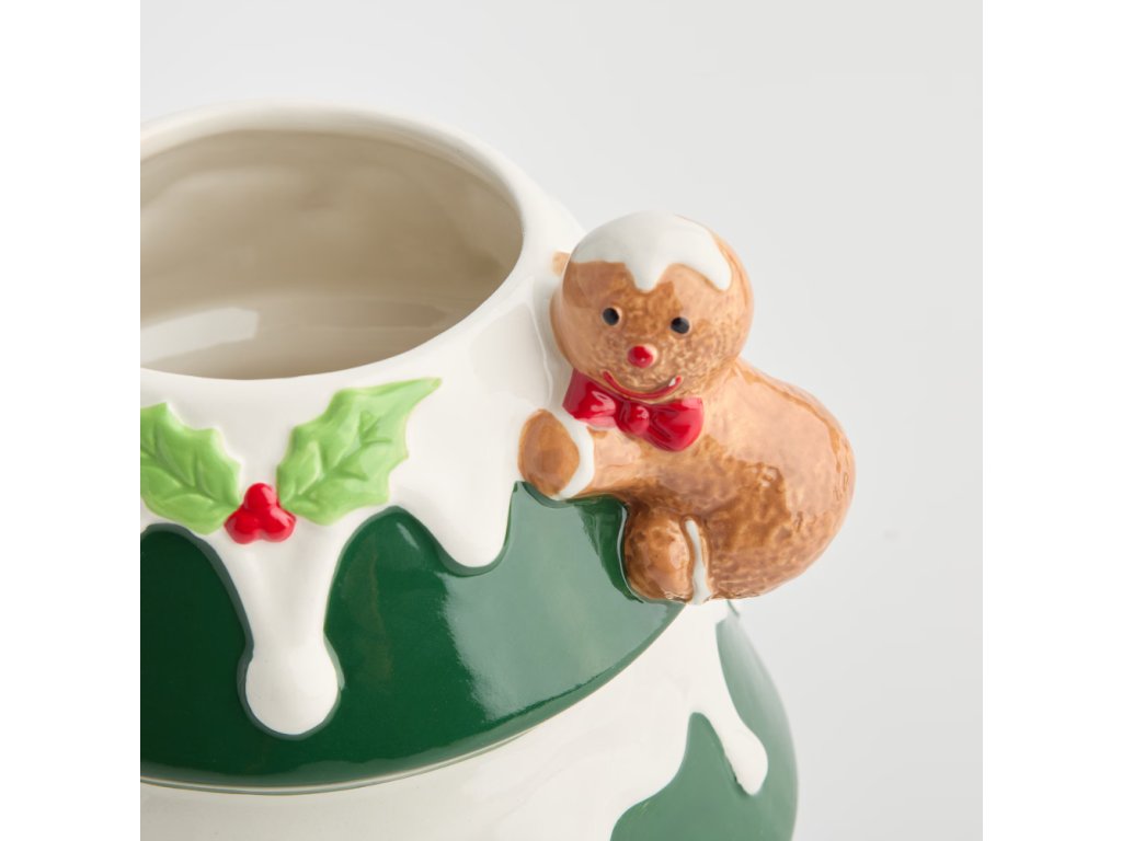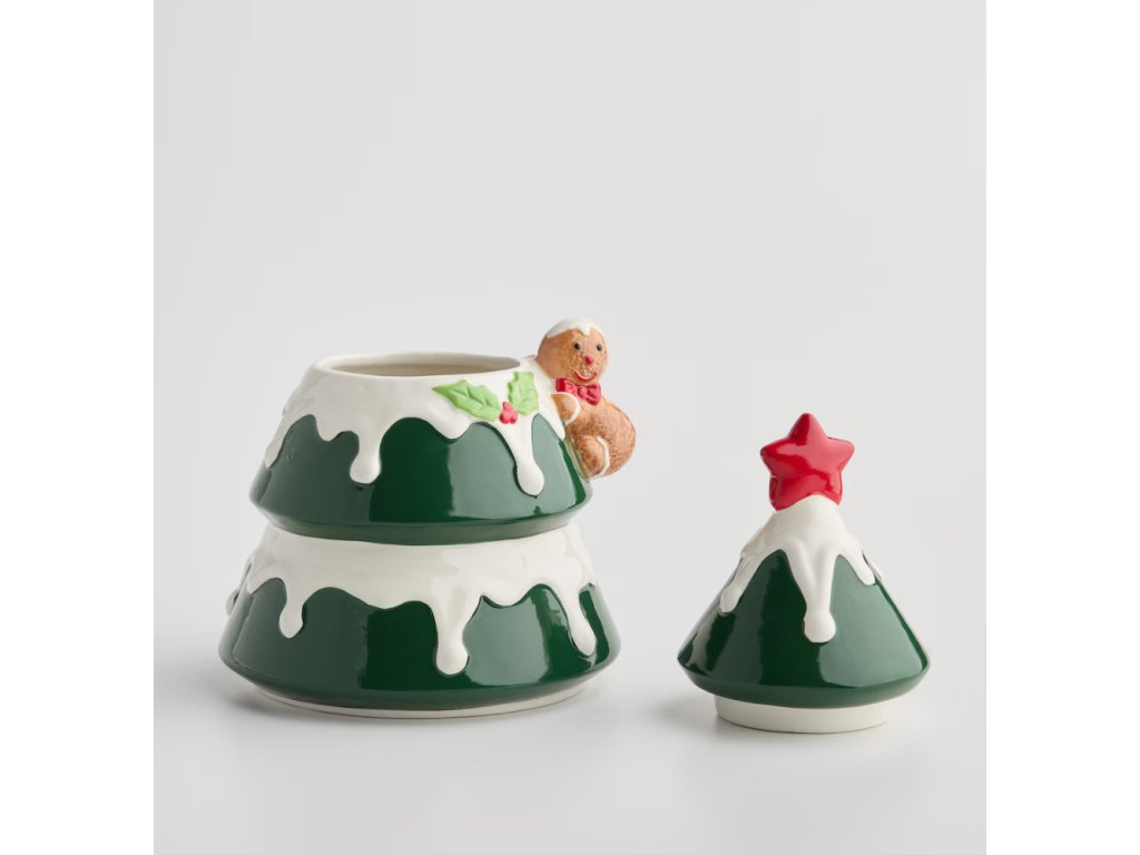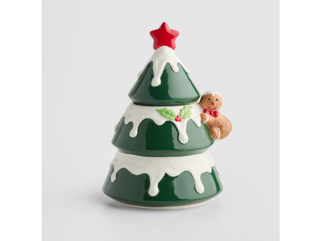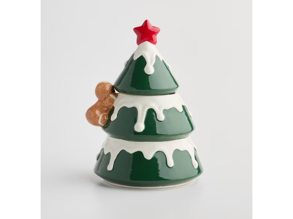 Vianočná radosť na tri poschodia! Táto keramická dóza v tvare stromčeka s perníkovým panáčikom a snehovou polevou udrží vaše sviatočné dobroty čerstvé a slávnostné. Ideálny doplnok pre tú najkrajšiu vianočnú atmosféru.