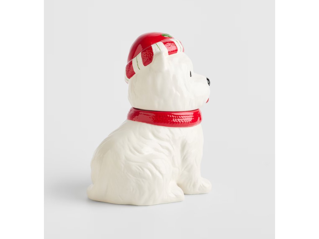 Nádoba zaujme farebným sviatočným vzorom – znázorňuje sympatického psa v červenom šále a čiapke s farebnými akcentmi. Lesklý, glazovaný povrch a precízne vyhotovenie detailov z nej robia ideálnu dekoráciu do moderných aj klasických kuchýň, a tiež originálny nápad na darček. Skvele sa hodí aj ako ozdoba stola počas sviatočných stretnutí.