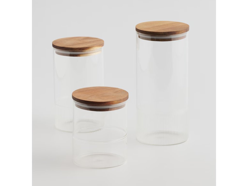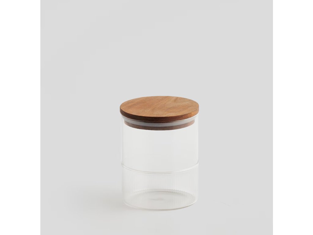 Nádoba na uskladnenie potravín z borosilikátového skla s prídavkom akáciového dreva a silikónu, s objemom 700 ml. Elegantná a funkčná, ideálna na uskladnenie potravín. Vďaka uzáveru zaisťuje čerstvosť a detaily jej dodávajú prírodný šarm.